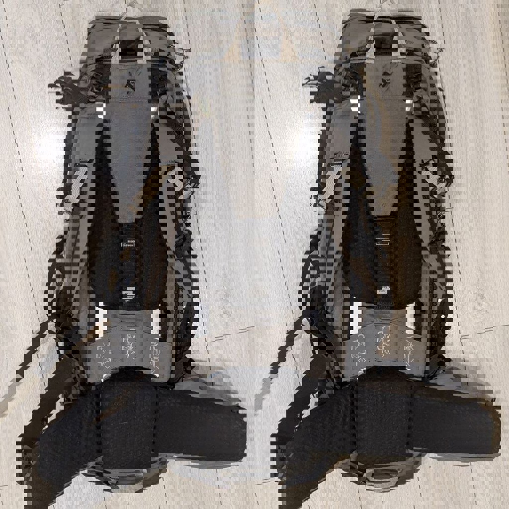 Не новый, но в очень хорошем состоянии. Очень (!) много кармашков для удобства хранения. Клапан отстёгивается и превращается в мини-рюкзачёк.