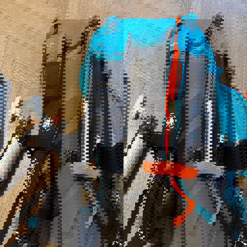 Рюкзак Mammut объёмом 30 литров с противолавинной подушкой и двумя новыми карбоновыми баллонами и тест тулом. Куплен в том сезоне, катан мало, в отличном состоянии, подушкой не пользовался.