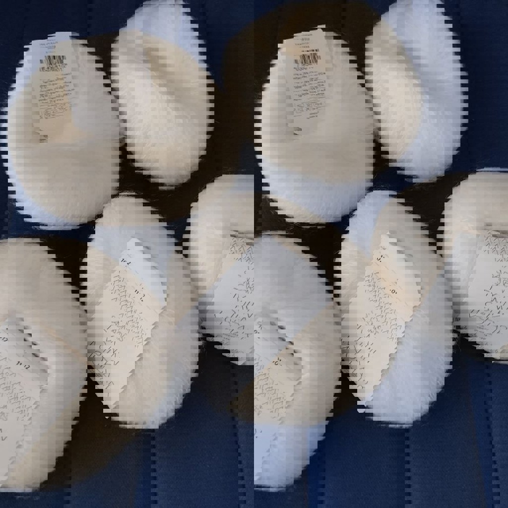 Пряжа цвет 1012, пять клубочков. 57 % мохер, 28% шелк, 15 % шерсть. Длина нити 25 граммового мотка пряжи 212 м. Свитер-паутинка размера S - 4 мотка.