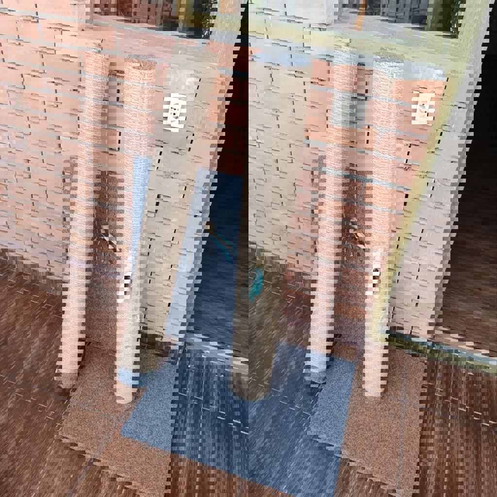 Прочная и устойчивая когтеточка высотой 1 метр, основание 50×60 см. Столб обмотан джутовым канатом, а широкая платформа с ковролином подходит для горизонтальной заточки. Подходит даже для крупных котов. Есть 2 висящие игрушки. Ручная работа, качественные материалы.
