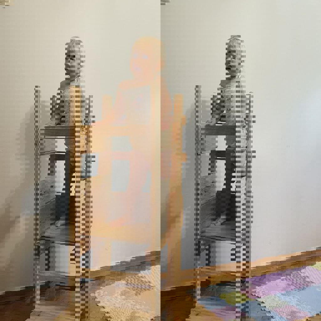 Очень устойчивая, тяжёлая, малыш не передвигает. Очень выручала, когда малышка только начала вставать. Ставили её в башню к окну и она подолгу разглядывала улицу. Потом, когда малышка активно поползла и пошла, то башня помогала быстро одеваться. Ставили к окошку, и пока ребенок смотрел на улицу, мы спокойно её переодевали, заплетали хвостики. Также во время готовки к столу тоже ставили, помогало поделать бытовые дела. Сейчас башня усовершенствована панелью с развивашкой, но её можно открутить.