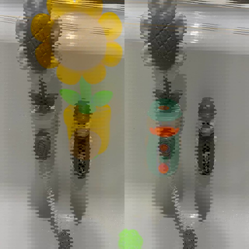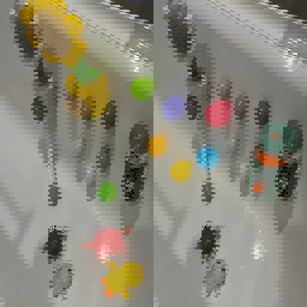 Сетка включает в себя 6 шариков на присосках Happy Baby, подсолнух помпу (при нажатии на кнопку брызгает водой), утку с мельницей и 2 заводные игрушки.
