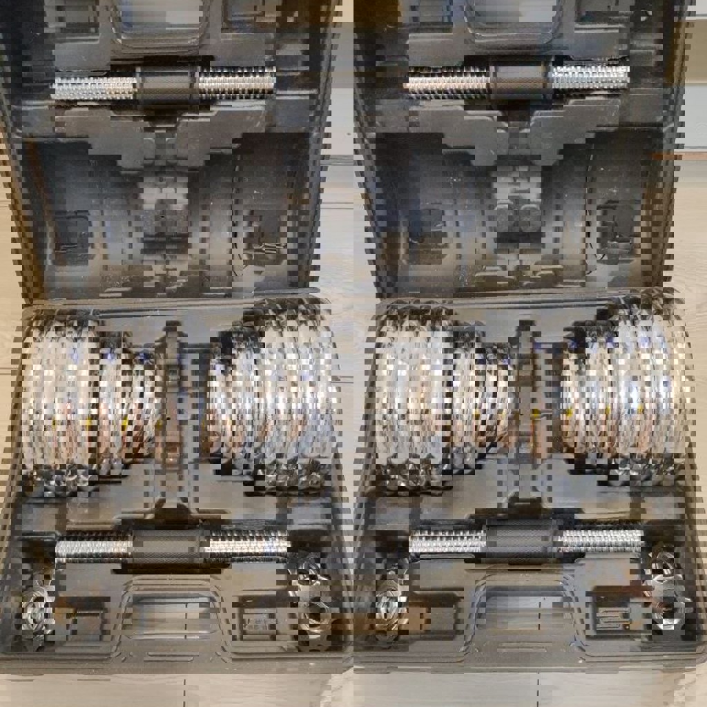 30 кг (15+15) — (8 шт блин 2,5 кг, 4 шт блин 1,5 кг, 4 шт блин 0,5 кг, 2 шт оси гантели 1.100 кг, 4 шт держатель 0,200 г.). Нюанс сломана крышка.