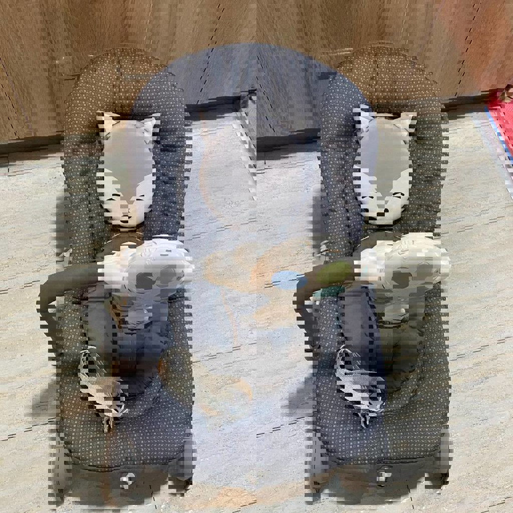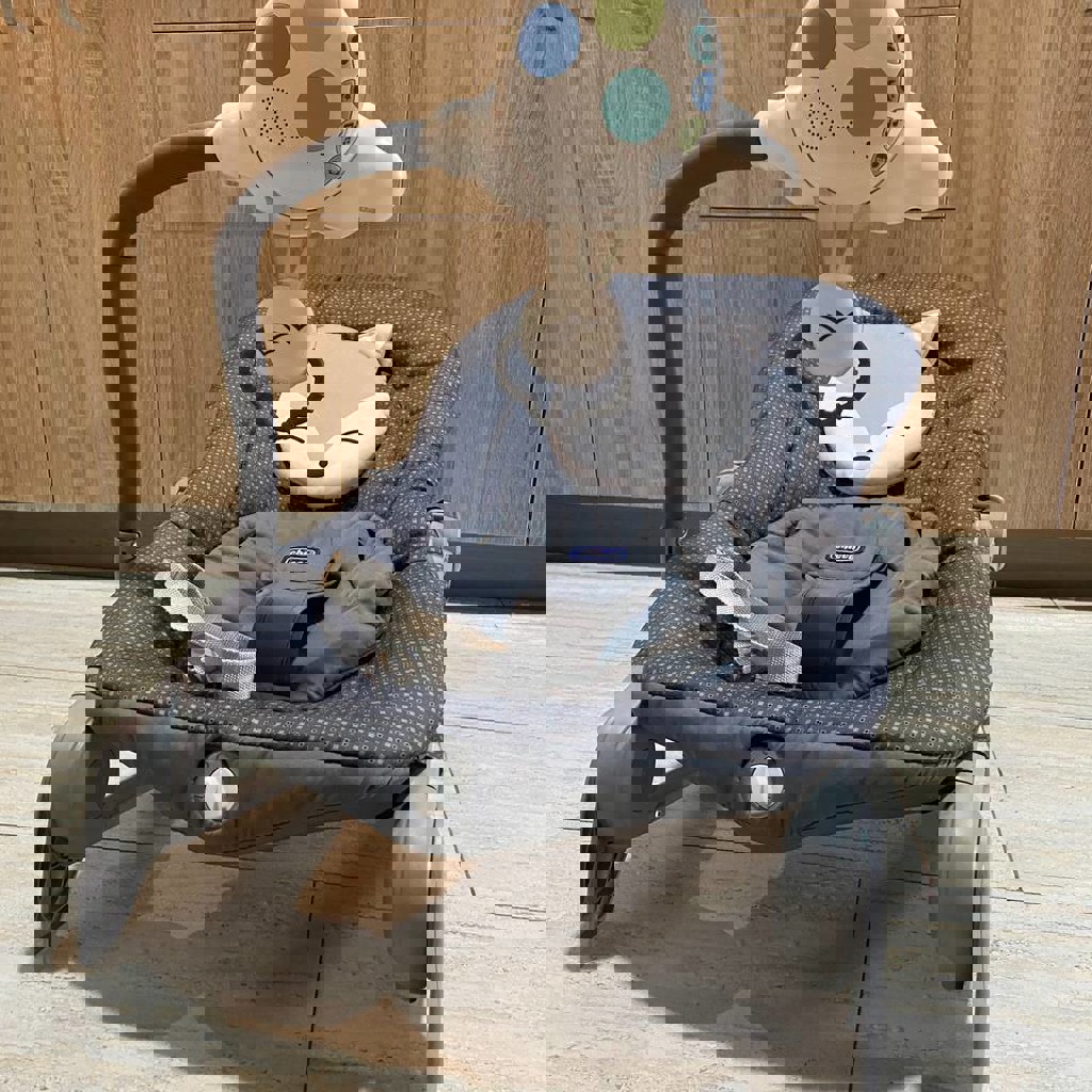 Шезлонг Chicco Ballon Foxy серый 0+, есть вибрация работает на батарейках. Несколько вариантов наклона, вкладыш для новорожденных.