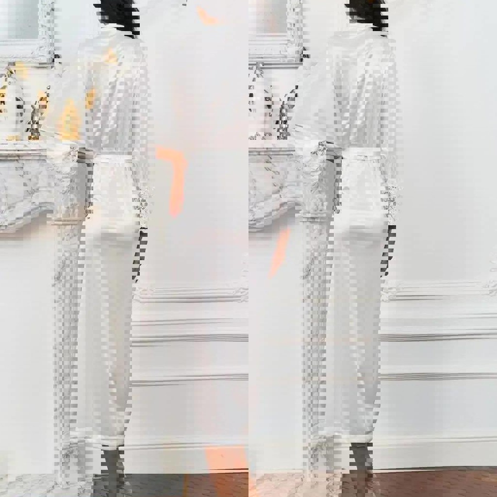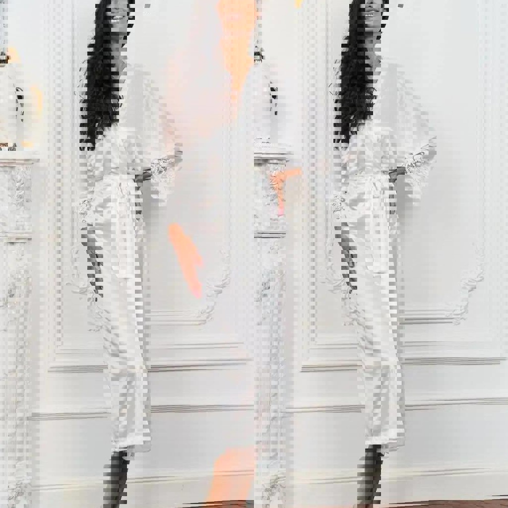 Пижама (майка + шорты) и халат длинный (130 см по спинке). Качественная фурнитура, бретельки регулируются. Нежный, элегантный, соблазнительный. В комплекте подарочная коробка.