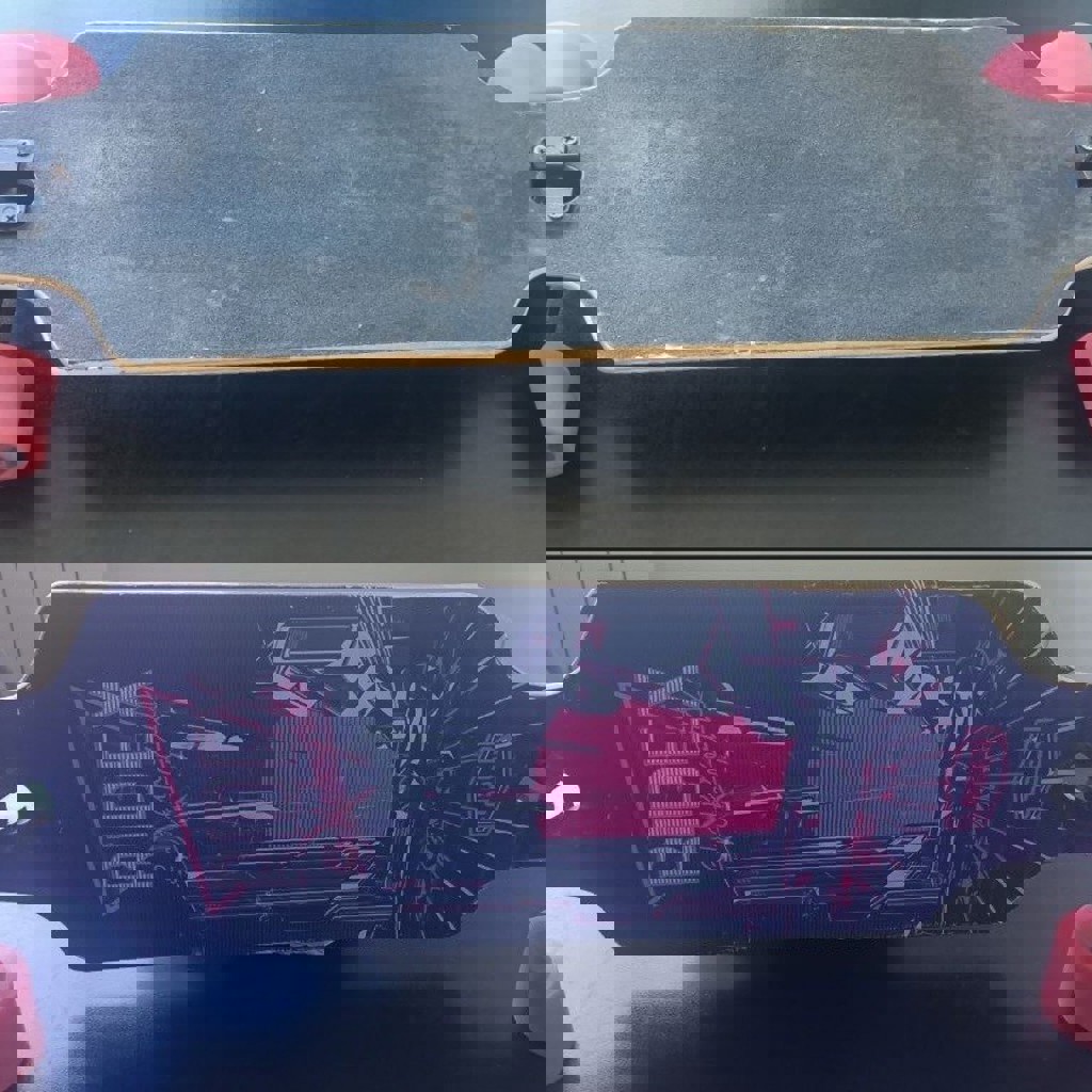 Дл.85см ш.20см, колеса 65х47мм 82А тяжелый и надежный, скорее на мальчика, дека без трещин, но потерта знатно. держит вес до 135кг.