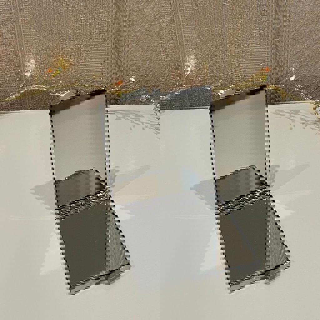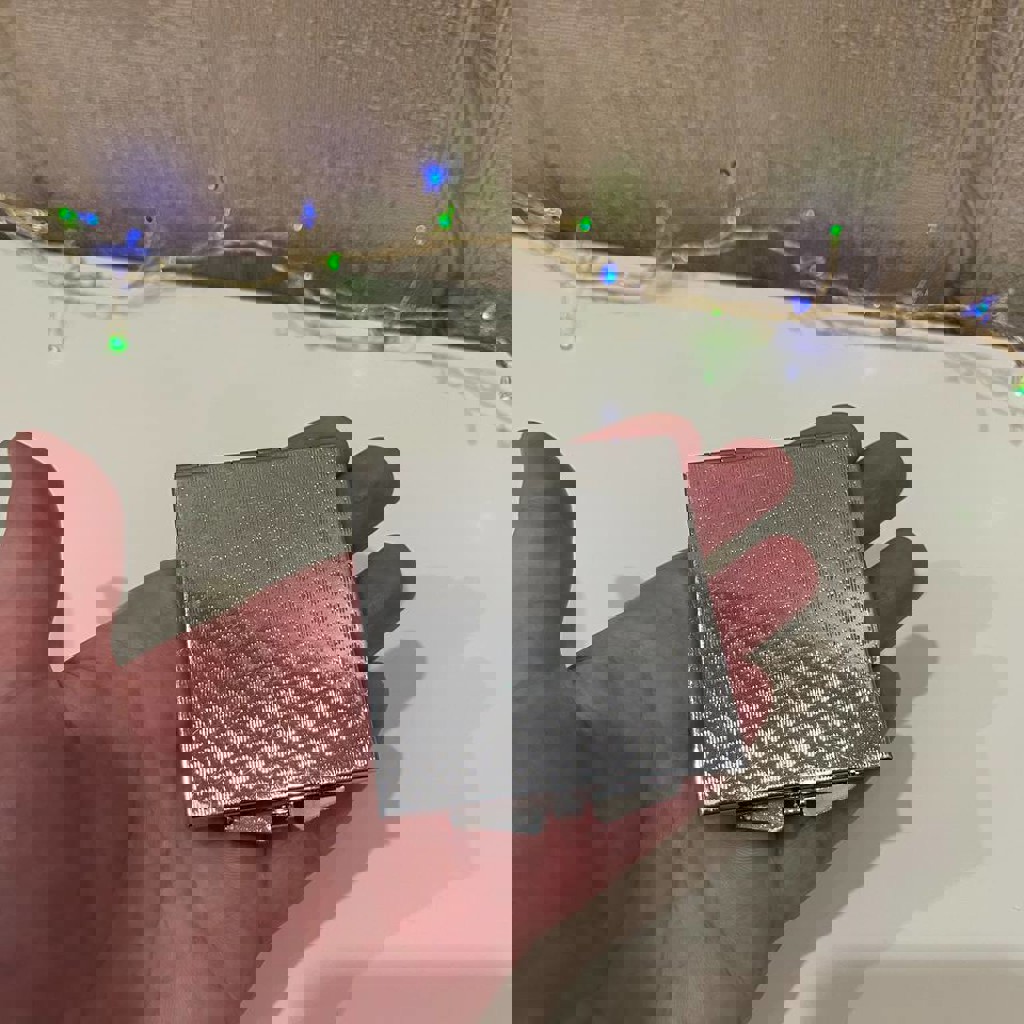 Розовые перламутр и стразы. Компактное (идеально для косметички), с двумя створками. Состояние: 9/10 (почти не использовалось, но есть царапинки)