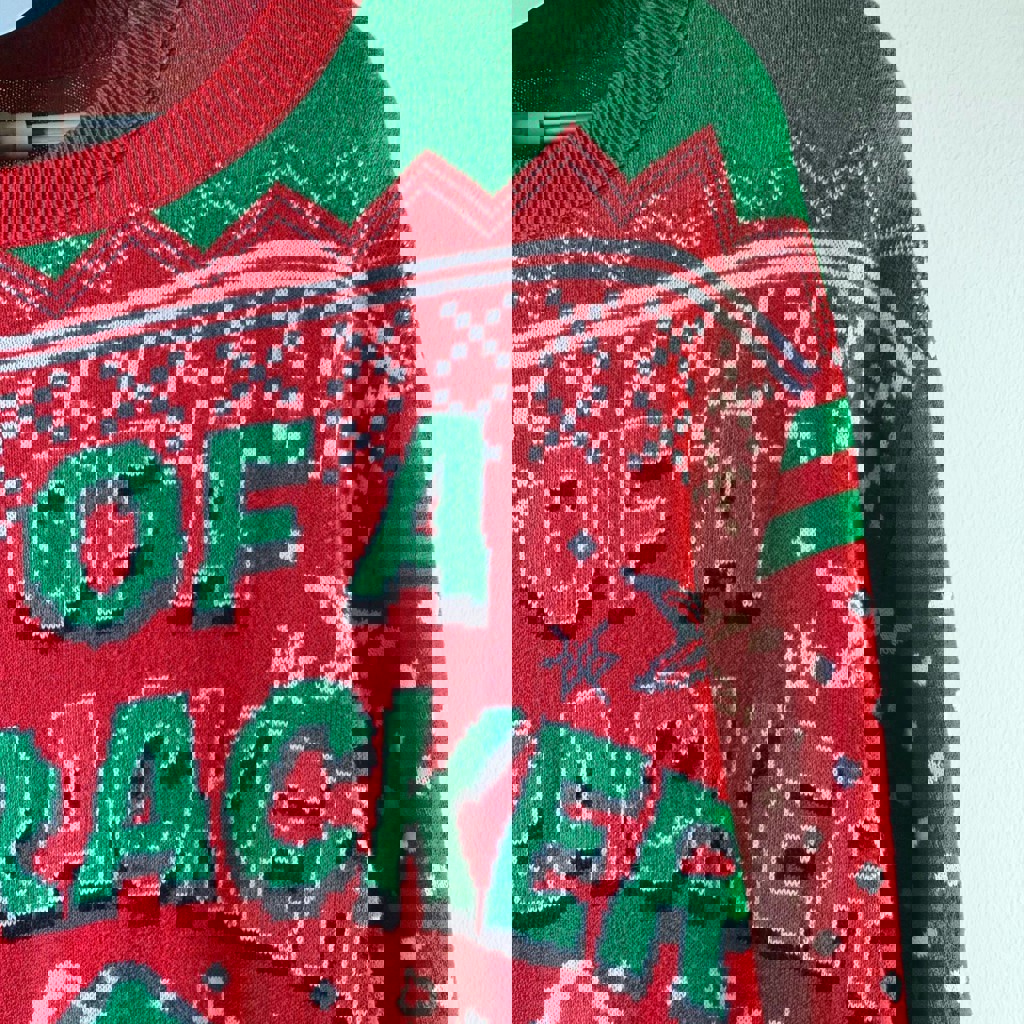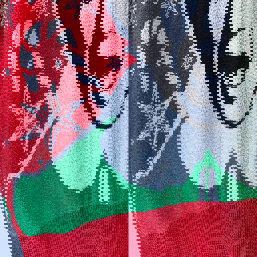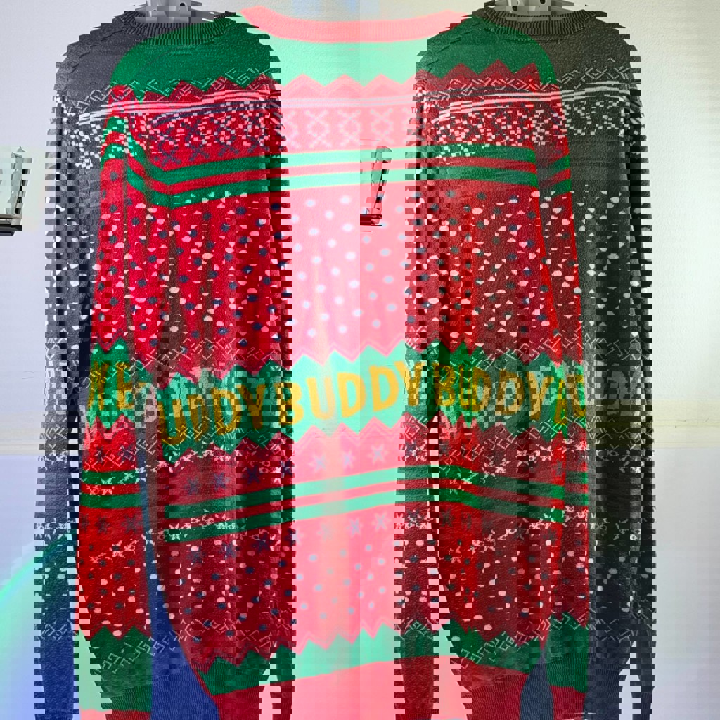 Это официальный Elf-мерч от Primark (коллекция AW21) — с культовой фразой и лицом Бадди, который орёт «SON OF A NUTCRACKER» примерно с той же эмоцией, что и мы, когда видим цены на авиабилеты в декабре. Размер: L (садится свободно, уютно и фотогенично). Состояние: отличное. Коллекция: официальная лицензия ELF/ Warner Bros. Отлично подходит: для вечеринок, семейных фоток, офисных конкурсов «у кого свитер хуже всех», да и просто для настроения. Реально редкая находка в Тбилиси.