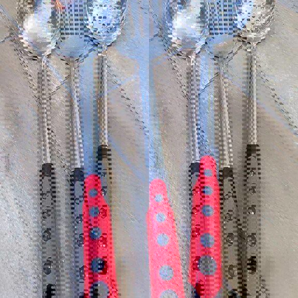 Набор из половника, шумовки и лопатки с красными ручками в хорошем состоянии — 30 лари