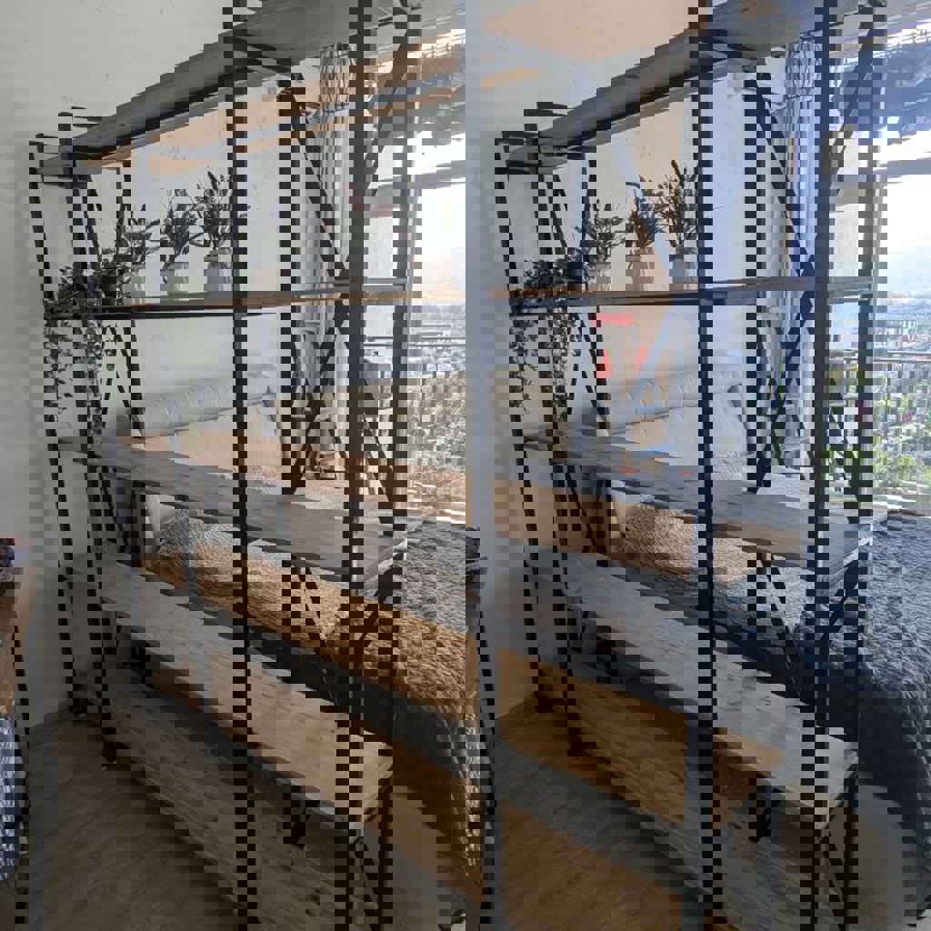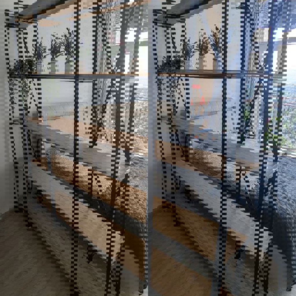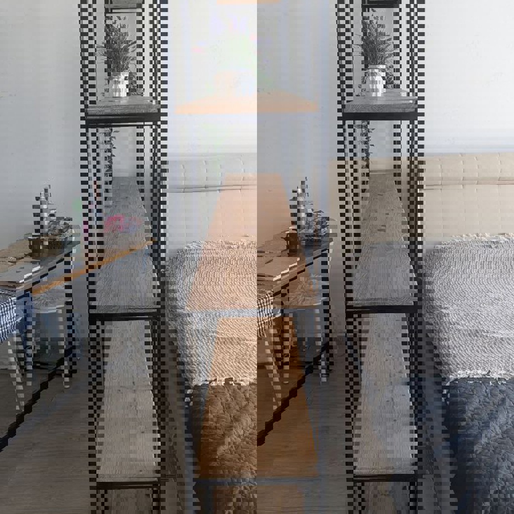 Стеллаж на черном металлическом каркасе с полками из натурального дерева. Высота 200см, ширина 220см, глубина 35см, расстояние между полками 42см.