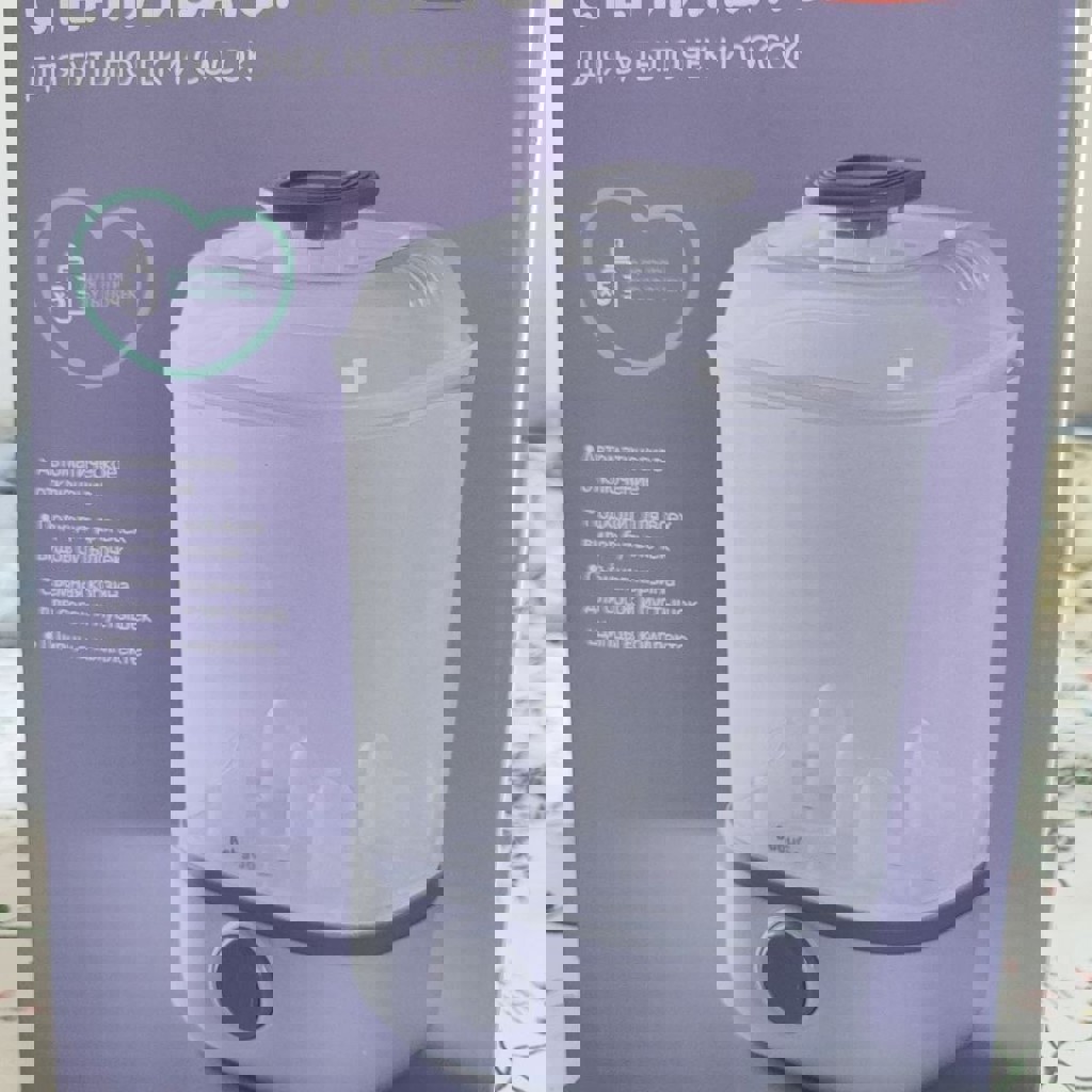 Новый стерилизатор для бутылочек и сосок. Подходит для всех видов бутылочек. Съёмная корзина для сосок и пустышек. Щипцы в комплекте. Коробка не открывалась (не понадобился).