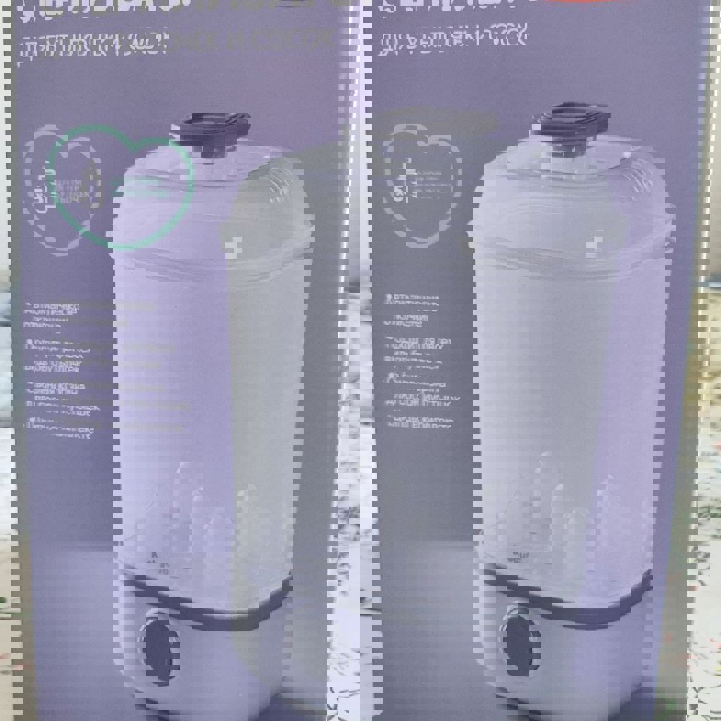 Новый стерилизатор для бутылочек и сосок. Подходит всех видов бутылочек. Съёмная корзина для сосок и пустышек. Щипцы в комплекте. Коробка не открывалась (не понадобился).
