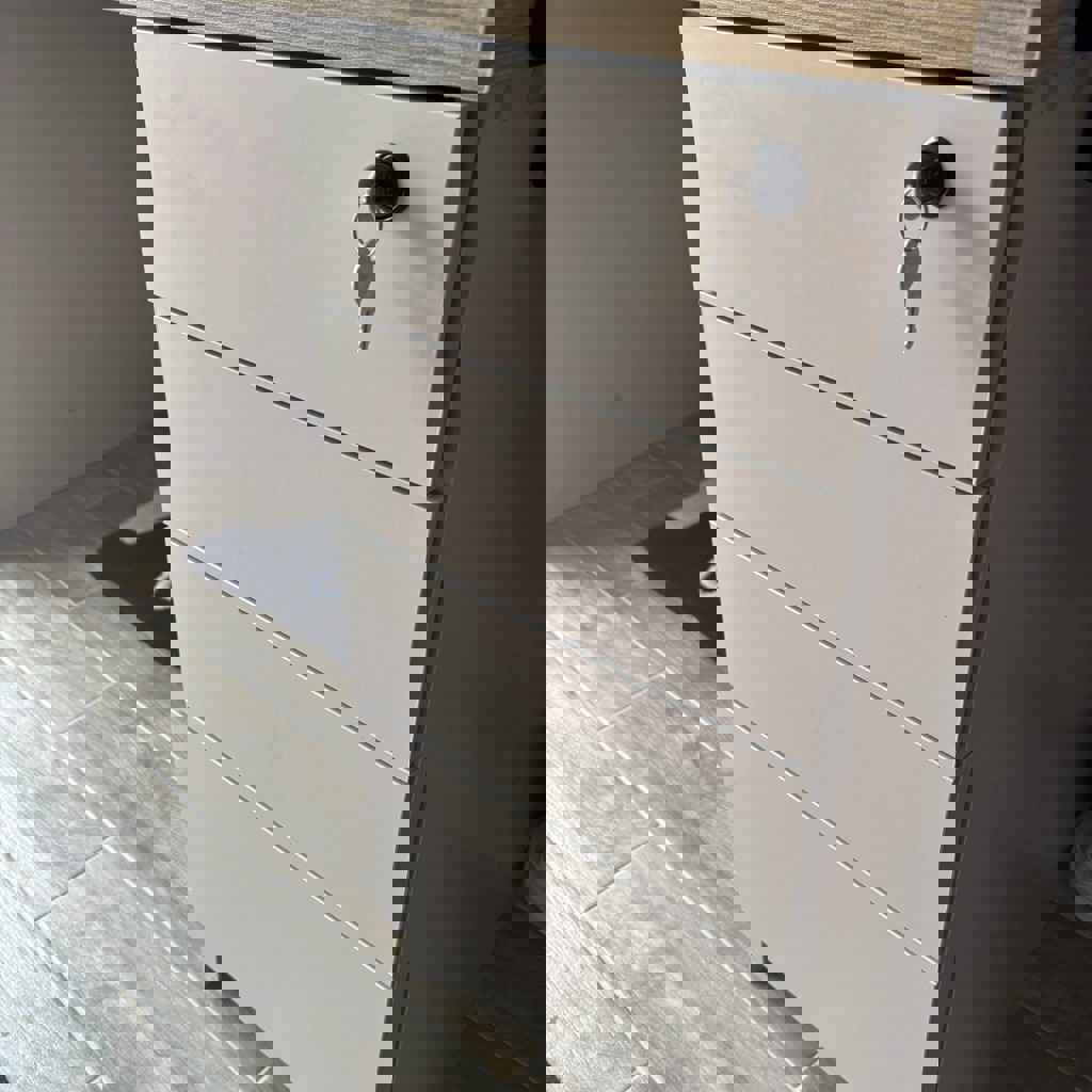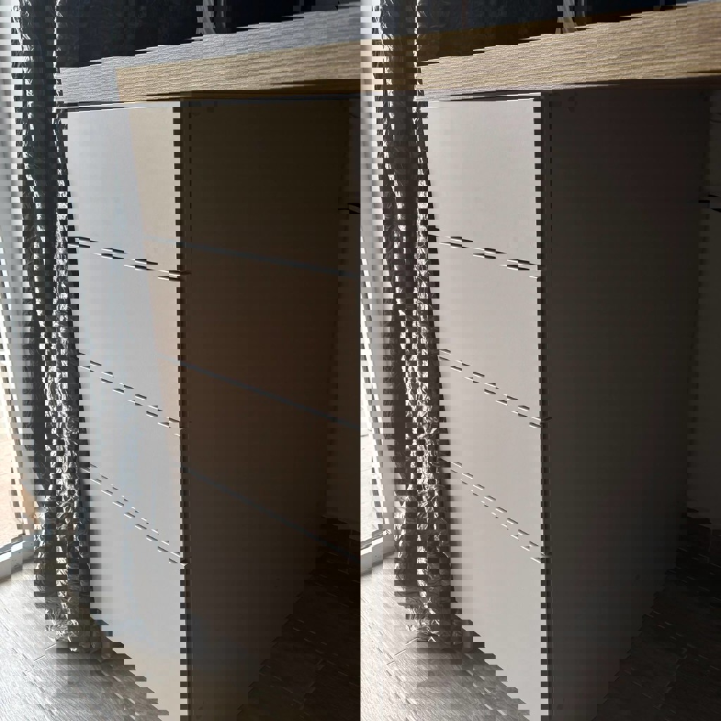 Стол из МДФ, размеры 170х70 см, высота около 80 см, расстояние между ящиками примерно 98 см, толщина столешницы 3.5 см. 8 ящиков с механизмом пуш ту опен, серый цвет, на свету чуть-чуть отливает светло-розовым.