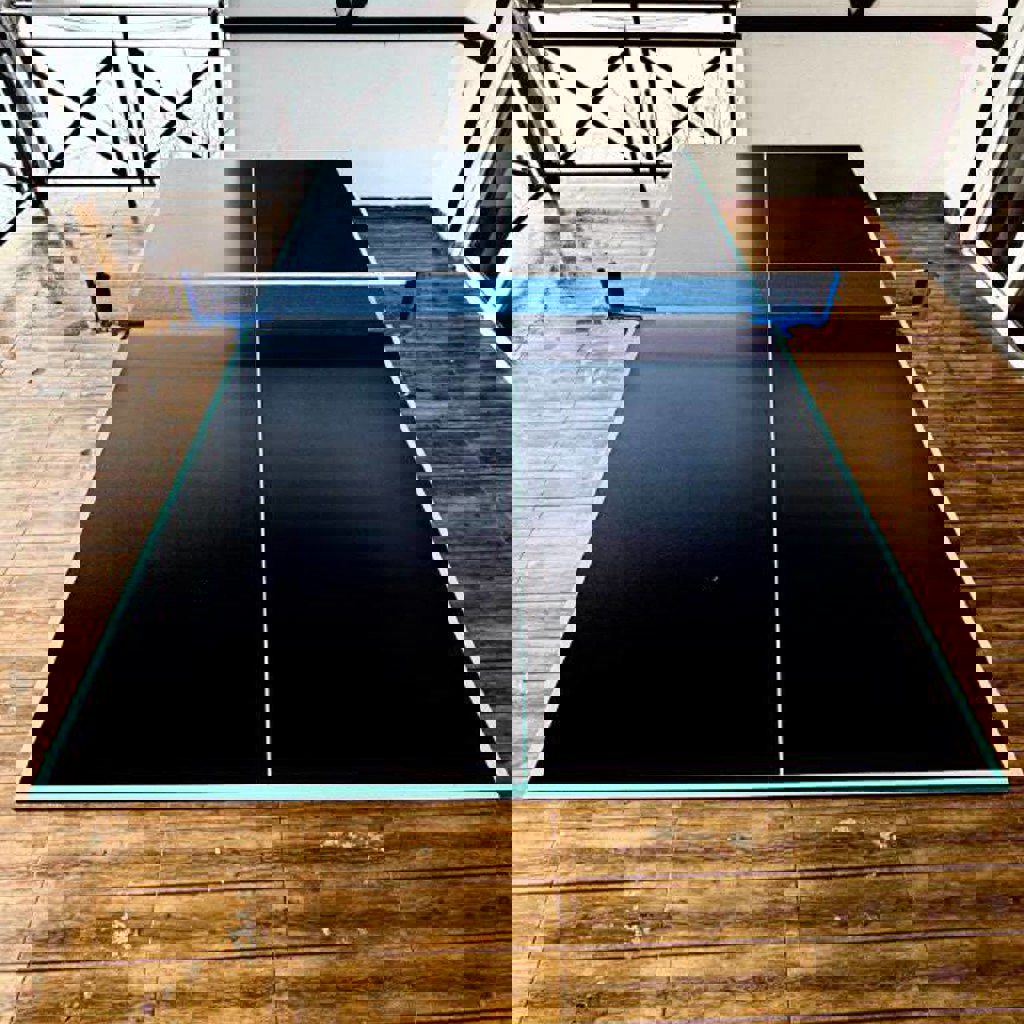 Модульный стол для игры в пинг понг. Легко разборный, легко перевозимый на авто. Есть возможность выбрать цвет полос разметки. Черный цвет. Габариты 2740x1525мм.