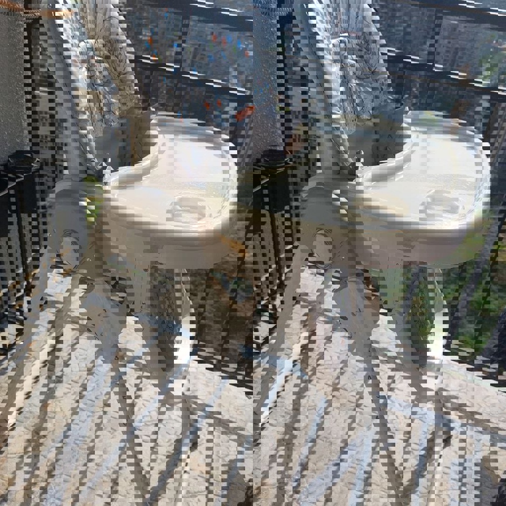 Очень устойчивый, регулируется по высоте. Чехол съёмный, легко моется. Есть небольшой дефект (на фото).
