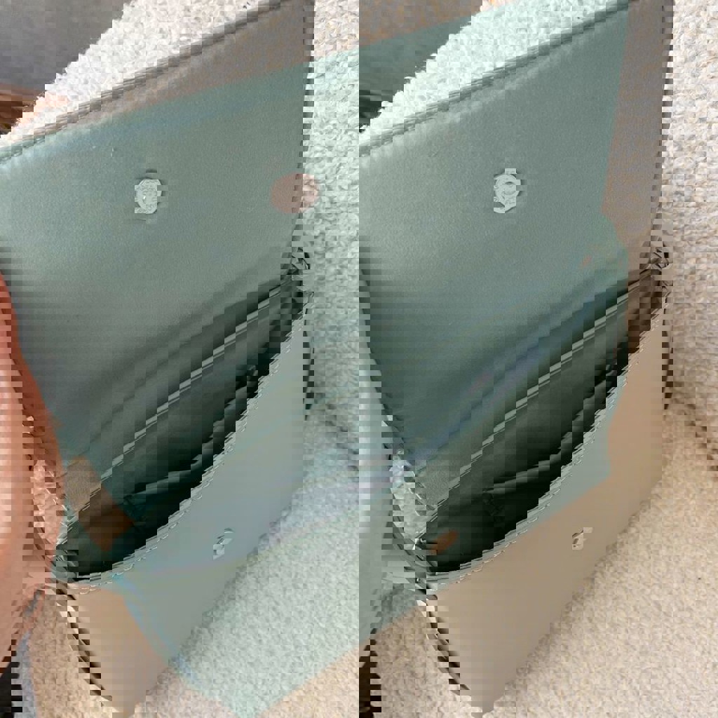 Выходила с ней один раз. Размеры 21х32х6(см). Кожзам. Внутри один маленький кармашек под мобильный телефон, без молнии.