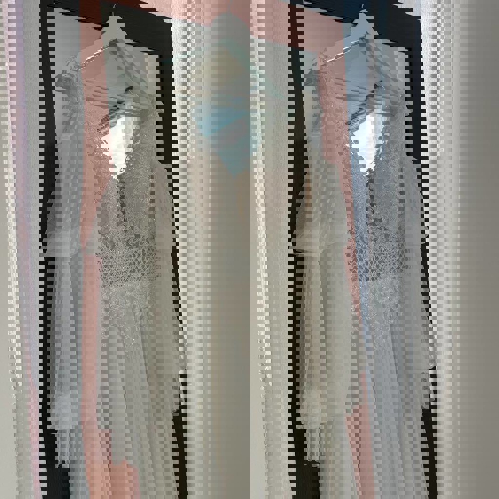 Красиво расшито стразами - изящно переливается при свете. Элегантно подчёркивает фигуру и смотрится очень нежно на фото и вживую. Подходит на грудь до 100 см, на рост до 165.
