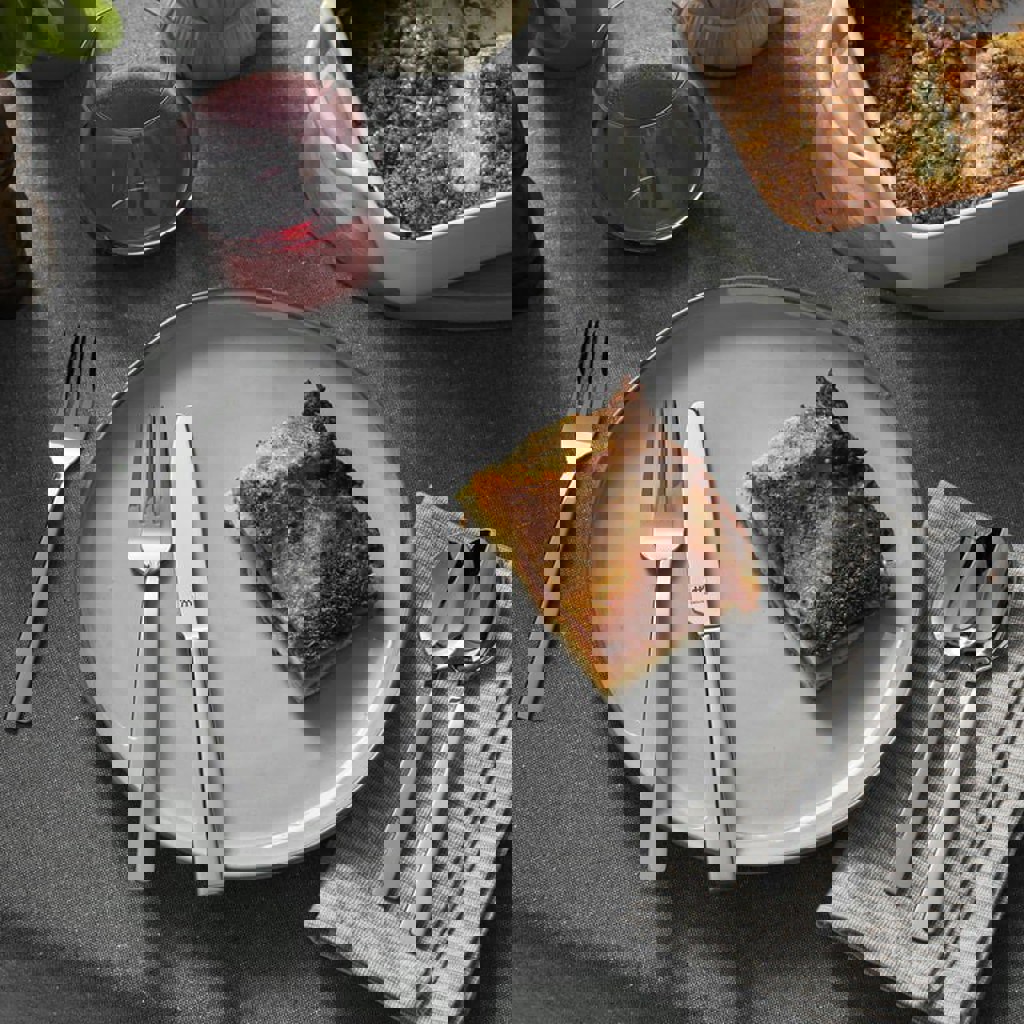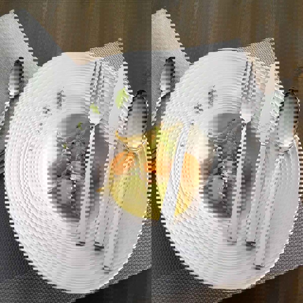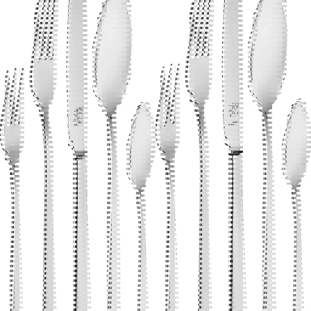Набор столовых приборов от Zwilling J.A. Henckels. Изготовлены из высококачественной нержавеющей стали. Поверхность отполированная, с закругленными краями. Приборы можно мыть в посудомоечной машине. Набор состоит из 6 столовых вилок, 6 столовых ножей, 6 столовых ложек, 6 десертных вилок и 6 ложек для кофе/чая.