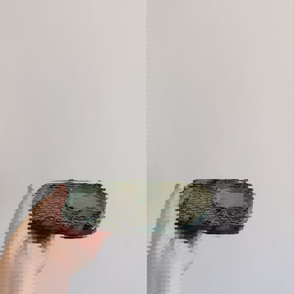 Зеленая тарелка для закусок из высокотемпературной глины ручной работы. Подходит для мытья в посудомоечной машине.