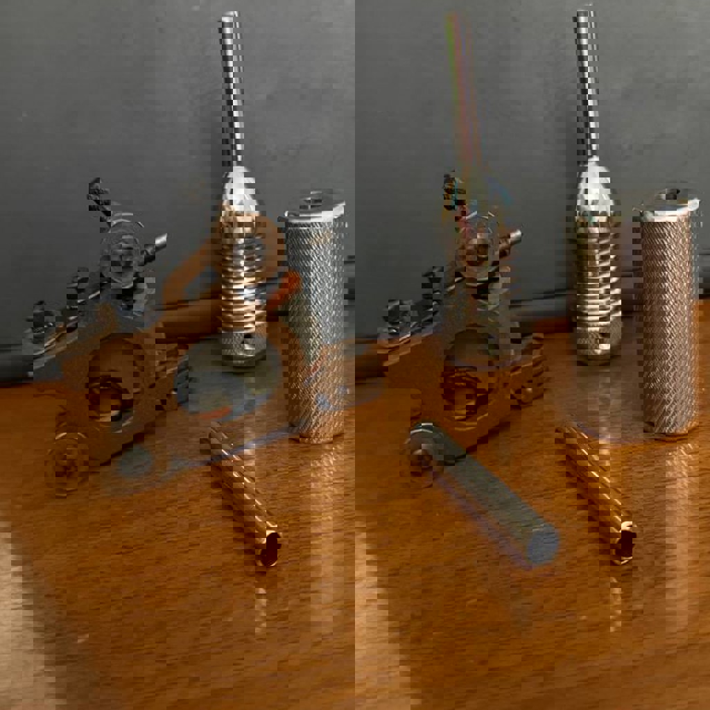 Полный комплект для татуировки, включающий индукционную катушечную машину, металлический грип и трубку, блок питания с контролем напряжения, педаль, клип-корд, силовые кабели и стойку для машины. Также в комплект входят расходные материалы, такие как одноразовые чернильные капсулы (белые и красные), ассорти резинок, розовая соединительная обертка, стерилизационные пакеты, защитная пленка, стерильные иглы Excalibur (в индивидуальной упаковке) и различные мелкие аксессуары.