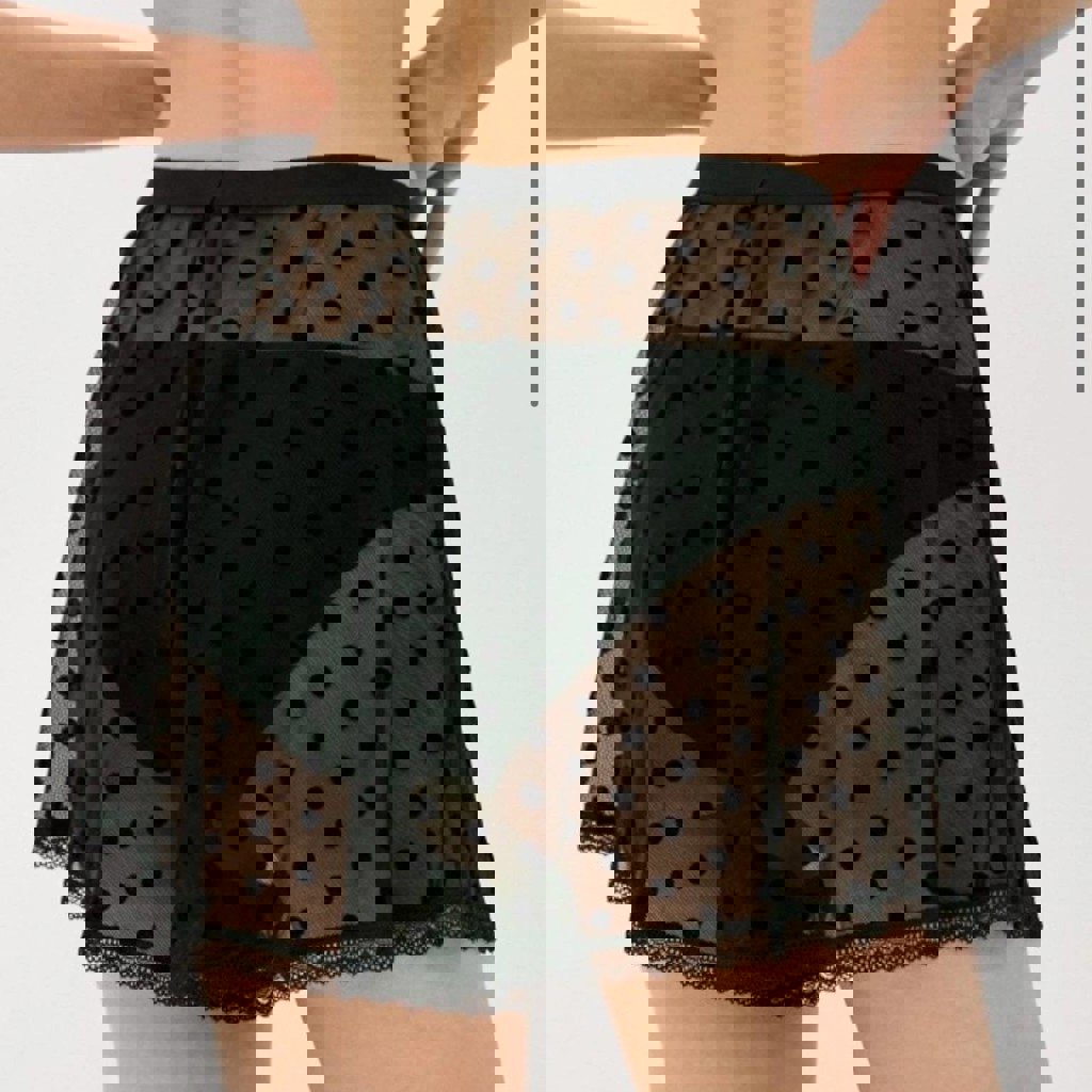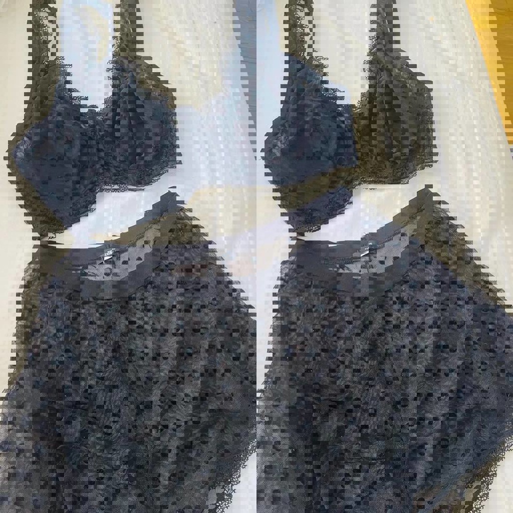 Комплект нижнего белья от бренда Tezenis выполнен из полупрозрачной сетчатой ткани в чёрный горошек. По срезаны бирки, вверх подойдет на чашку B-C, но маленький объем. Шорты на S-M.