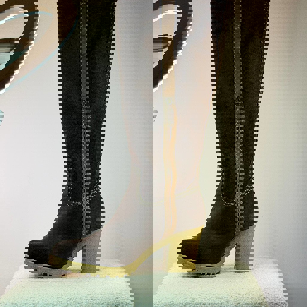 Оригинальные зимние сапоги Tommy Hilfiger; натуральный плотный коричневый замш; внутри — тёплый мех, идеально на грузинскую зиму; устойчивый каблук + тракторная подошва — комфортно даже по льду и мокрому асфальту; высокая голень (до колена), визуально вытягивает силуэт; фирменные кожаные детали и контрастная строчка в стиле Hilfiger тех лет; состояние отличное, замш ровный, форма держится.