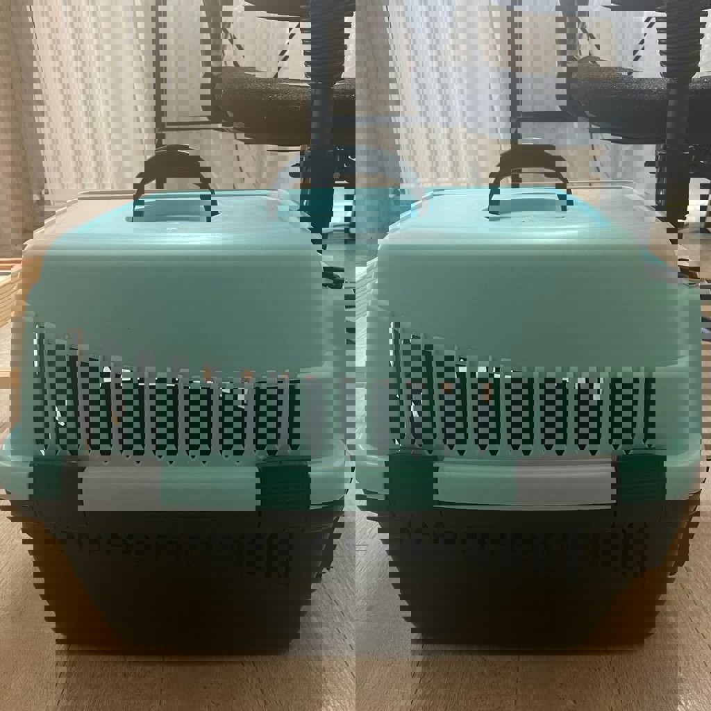 Пластиковая жесткая клетка для собак и кошек. Новая, в использовании не была, животных не видела. Все защелки работают.