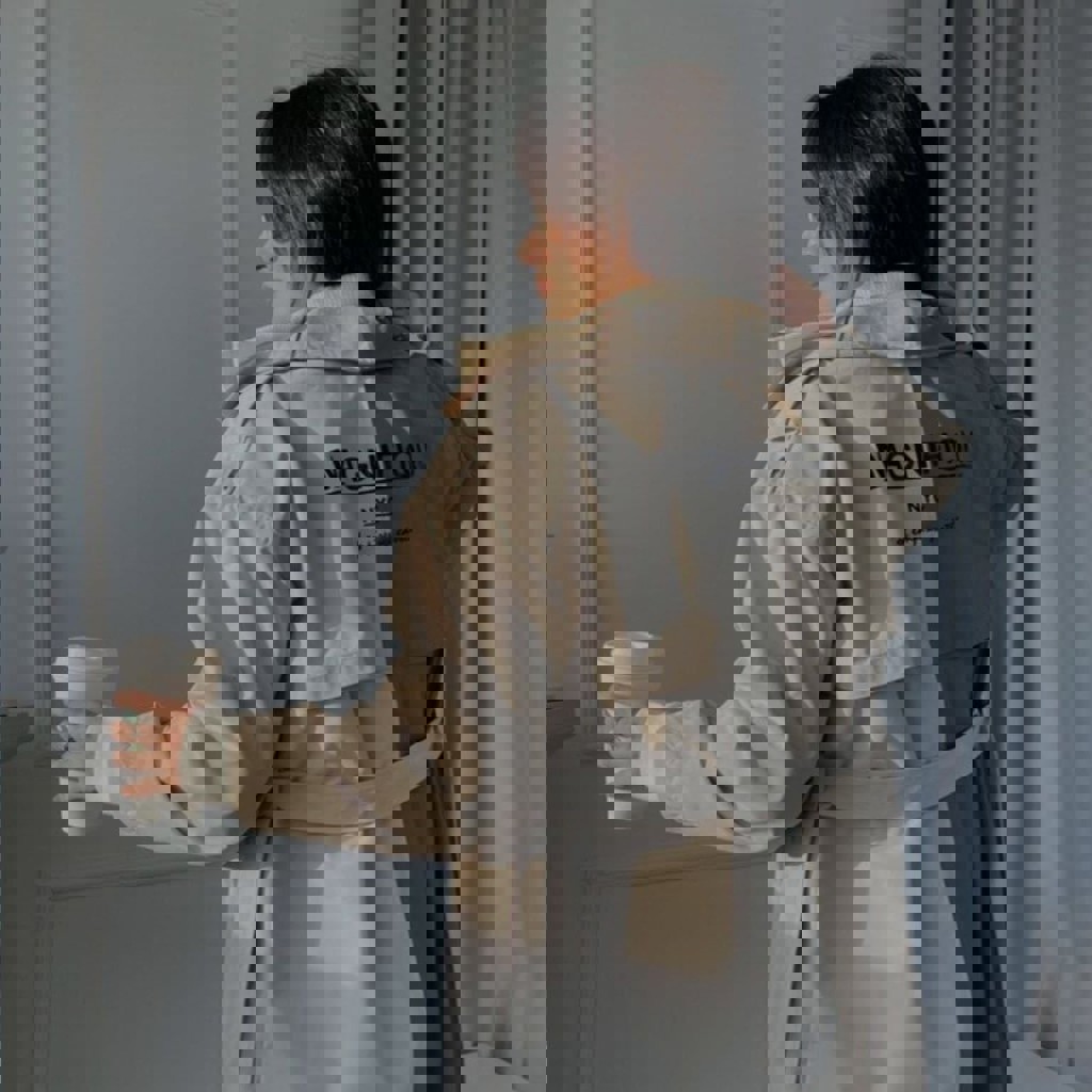 Двухцветный (беж + оливка), эффектный колор-блок — выглядит дорого и необычно. Свободный оверсайз крой: носится и с поясом, и нараспашку. На спине надпись MAGNIFIQUE NYC — добавляет характера. Состояние отличное, надевался пару раз. Идеален для батумской весны.