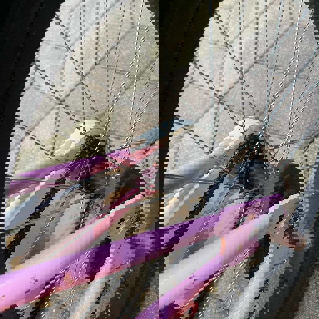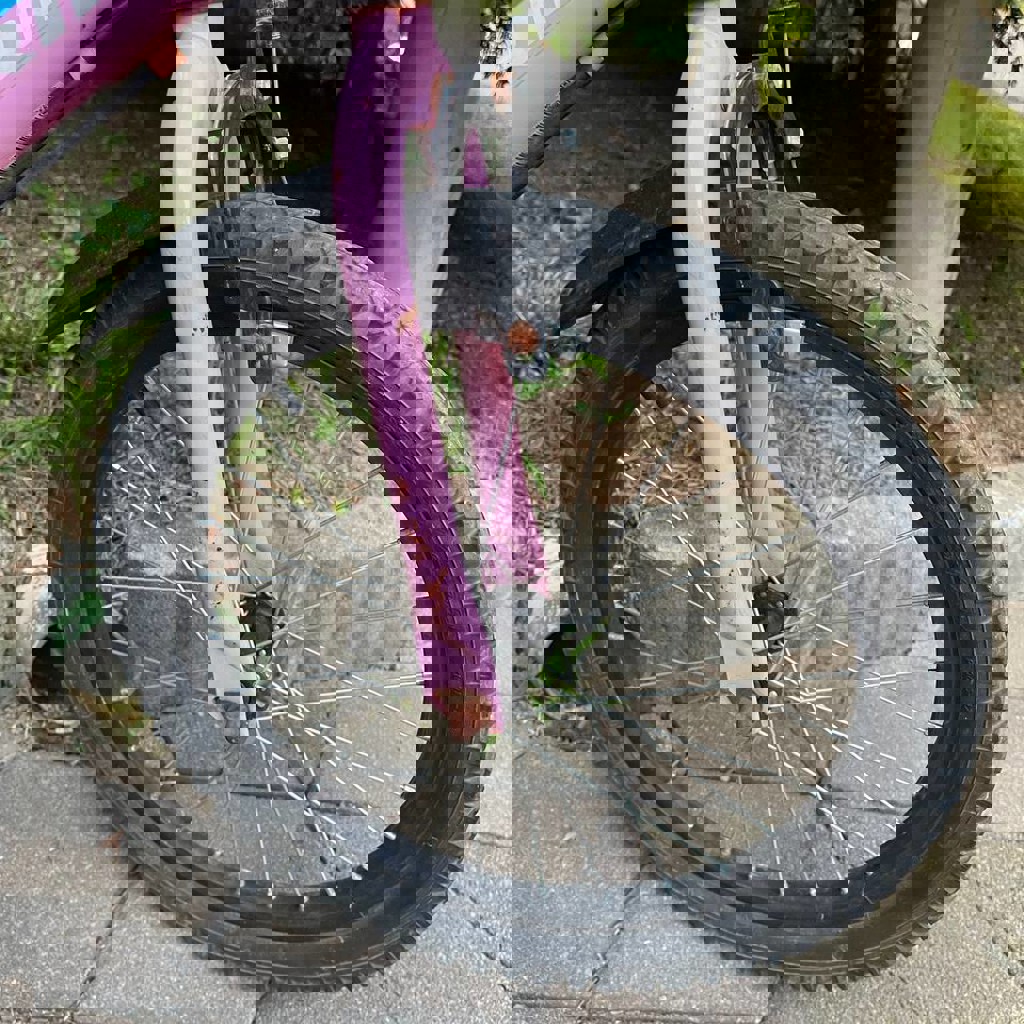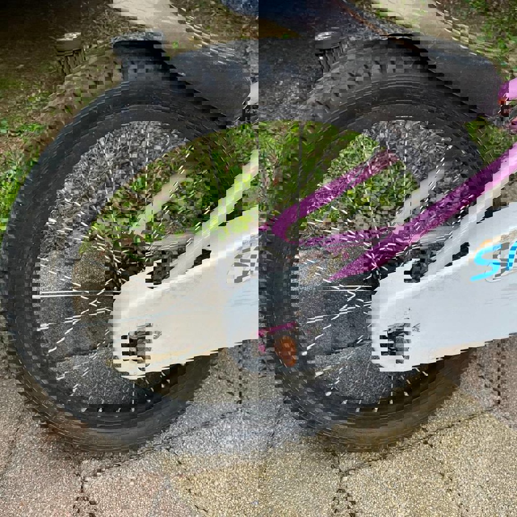 В отличном техническом состоянии, все исправно, ребенок вырос, из-за влажности в аджарии есть мелкие нюансы, на качество эксплуатации не влияет, колеса 18 дюймов, для ребенка от 4-7 лет, есть боковые колеса в комплекте.
