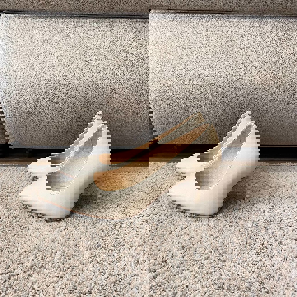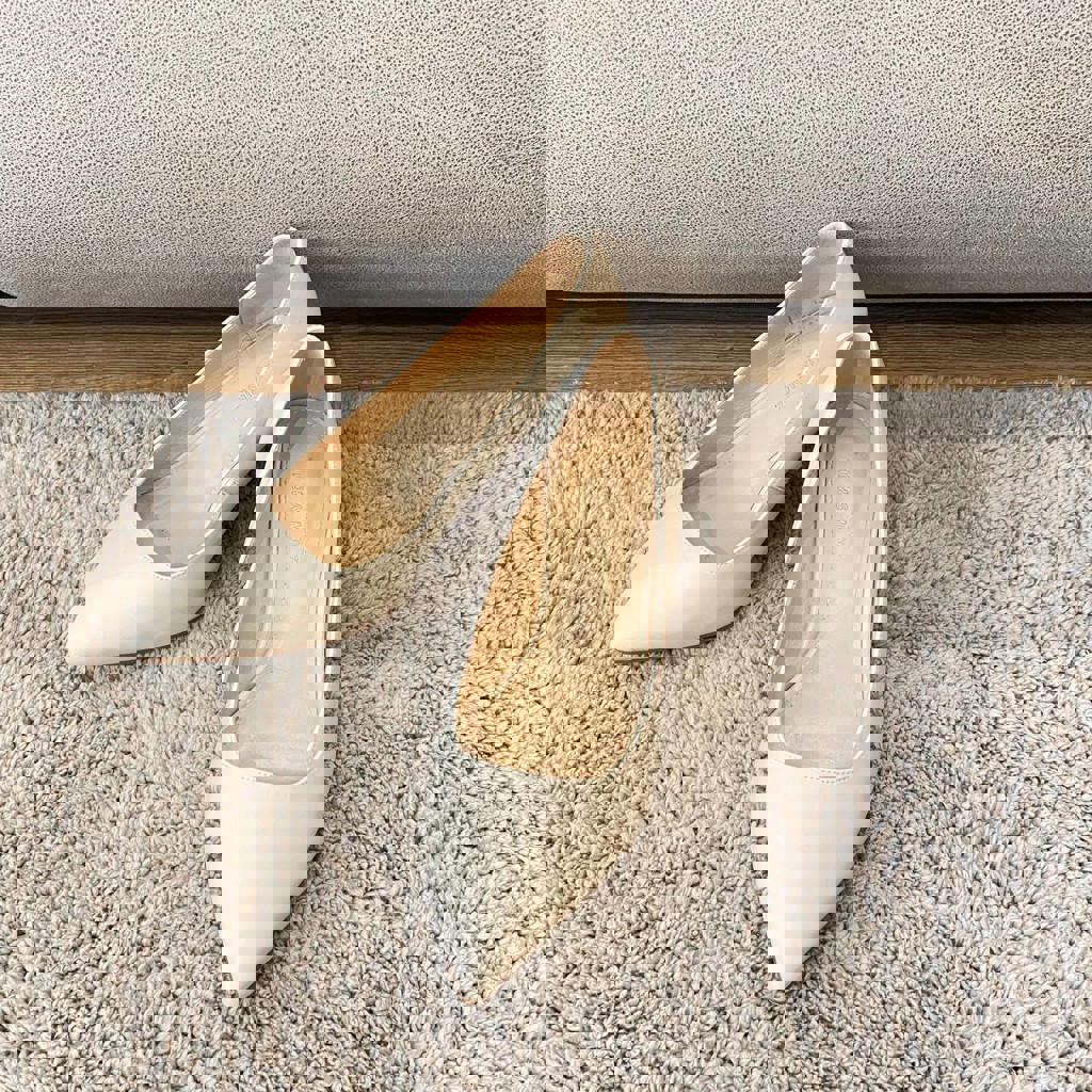 Светло-бежевые, почти белые. Размер 38,5. Высота каблука - 4см, вместе с опорой каблука - 7см. Удобная колодка, универсальная модель.