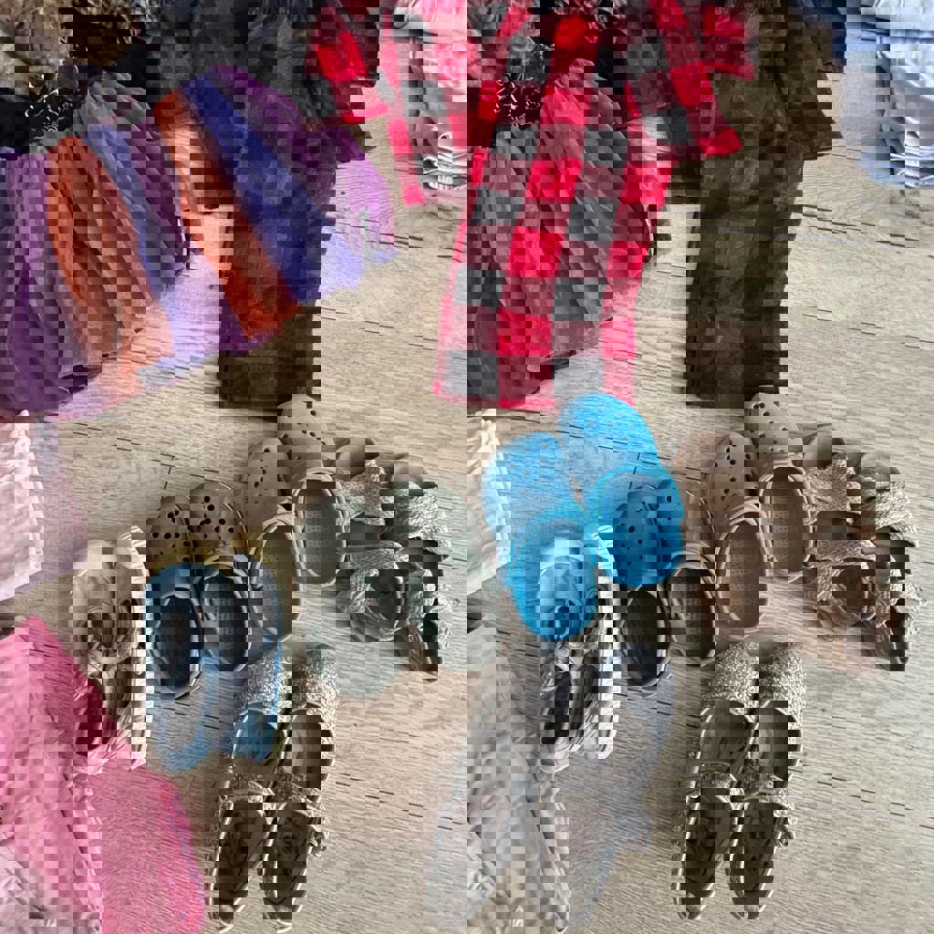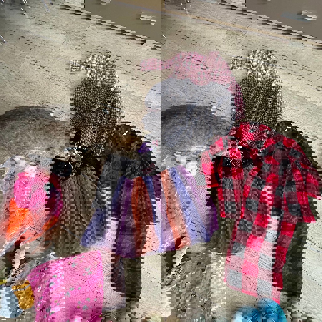 Все опрятное, стираное, где-то есть затяжки на платьицах. Из вещей: теплые платья, шапки, пижамы, штаны, маечки, немного игрушек, купальники, кроксы.