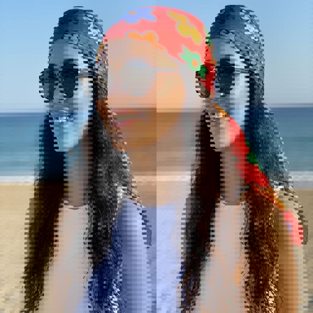 Винтажный квадратный платок из 100% натурального шёлка. Яркий принт в стиле 70-х — красный фон, цветочные мотивы, смотрится очень эффектно. Размер 100×100 см, можно носить как платок на шею, бандану, аксессуар для сумки или на пляж. Новый.