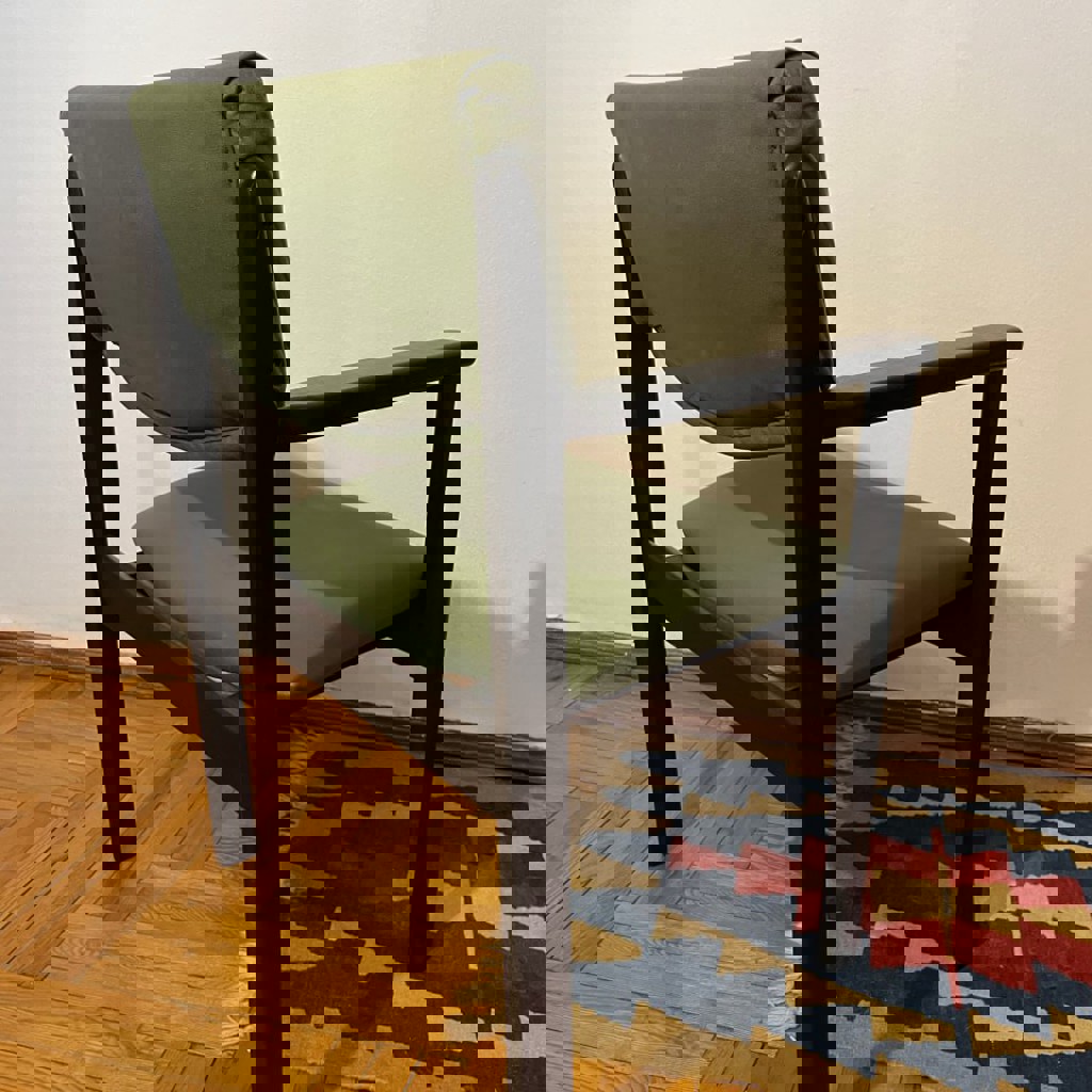 Винтажное кресло в стиле середины XX века, массив бука, 1960–70-е годы. Восточноевропейский модернизм: лаконичная геометрия, выразительные подлокотники, удобная посадка. Кресло после аккуратной реставрации: укреплены соединения, новая качественная обивка. В отличном состоянии, полностью готово к использованию. 57 ✕ 45 ✕ 83 см. Подойдёт для дома, студии или рабочего пространства.