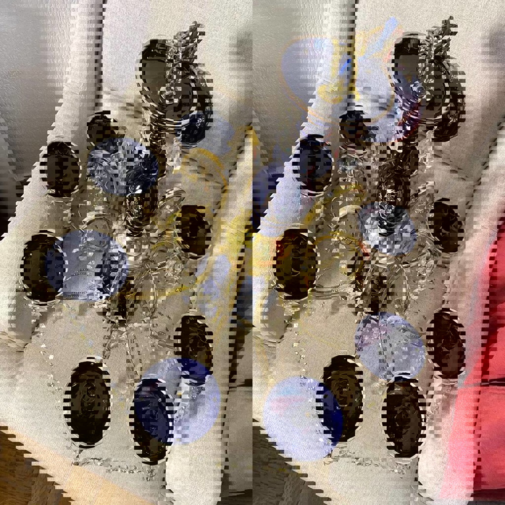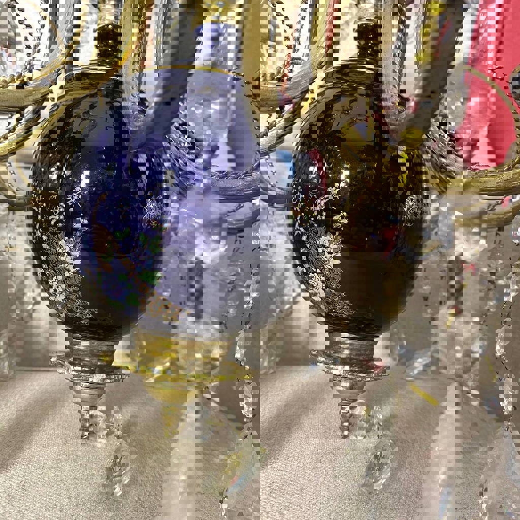 Продаю роскошную восьмирожковую люстру второй половины XX века. Изысканное сочетание глубокого кобальтового фарфора, золочения и латуни. Особенности и детали: • Стиль: Шинуазри (Chinoiserie), Hollywood Regency. • Декор: Фарфоровые элементы украшены классическим восточным сюжетом — золотой павлин в окружении цветущих пионов. • Материалы: Основание — латунь, плафоны-розетки и центральный ствол — глазурованный фарфор, подвески — граненый хрусталь. • Состояние: Люстра полностью в сборе, проводка проверена и готова к эксплуатации. Присутствует косметический скол на верхней фарфоровой чаше (у потолочного крепления), который при монтаже остается практически незаметным и не влияет на конструктивную прочность. Эта люстра станет центральным акцентом в классическом или эклектичном интерьере, добавляя пространству коллекционный шарм и историческую ценность.