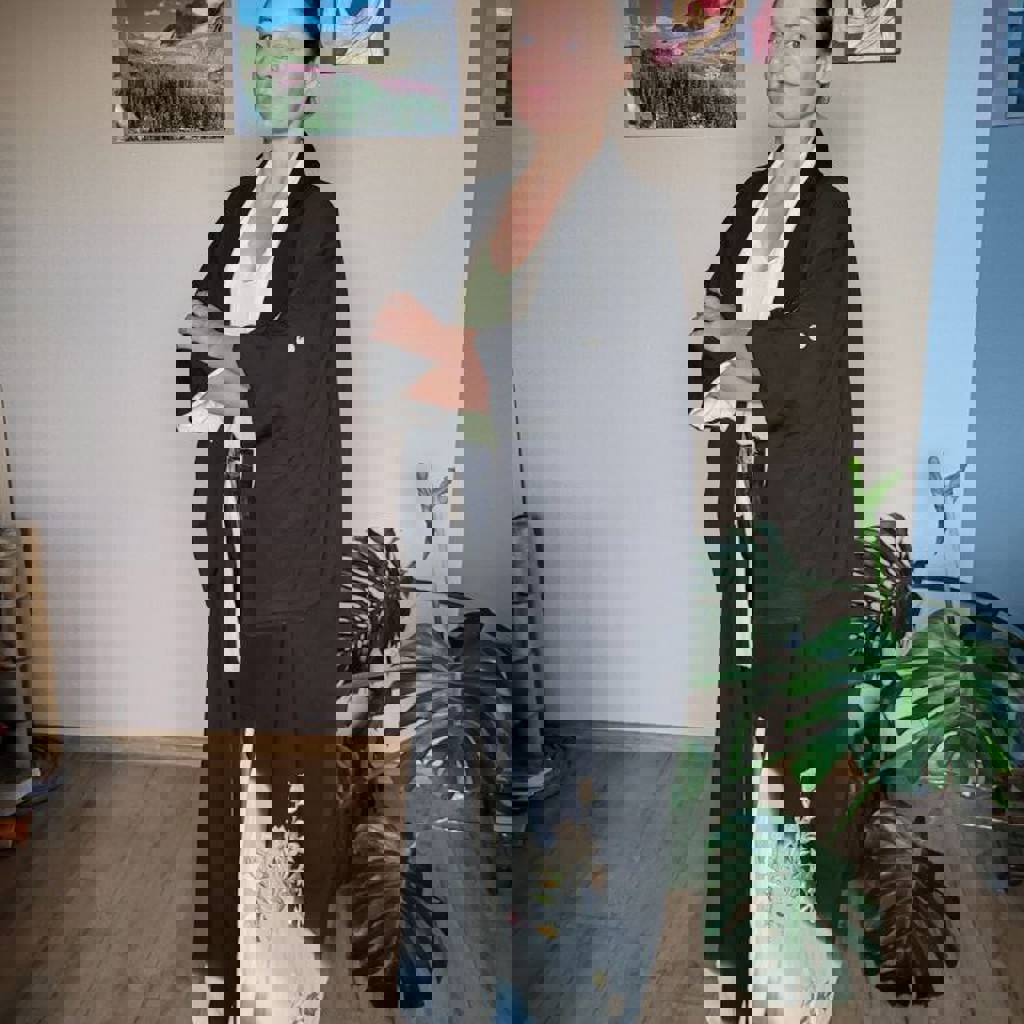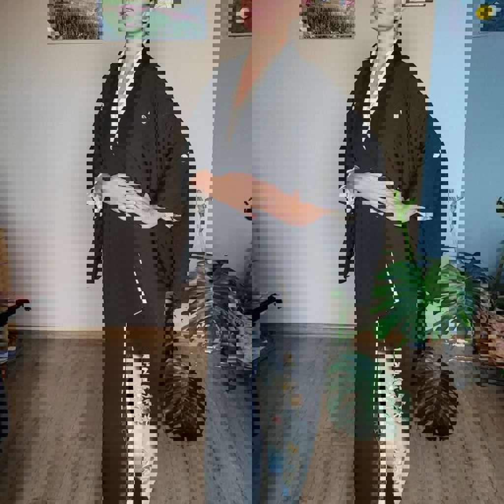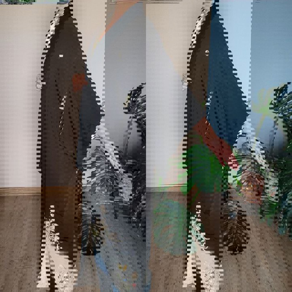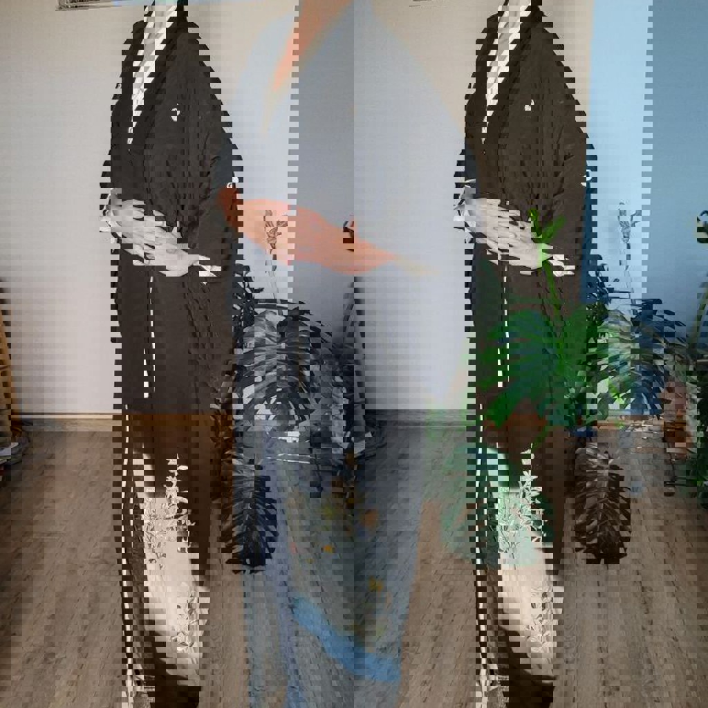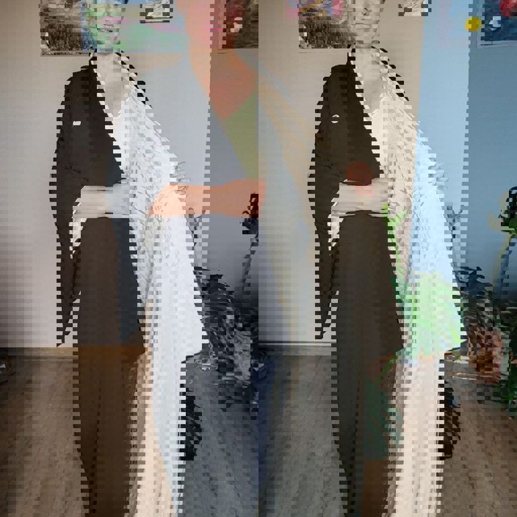 Ручная работа, выполнена из шелка и штапеля. Доступна в размерах SX/S/M. Модель подходит для людей ростом 170 см.