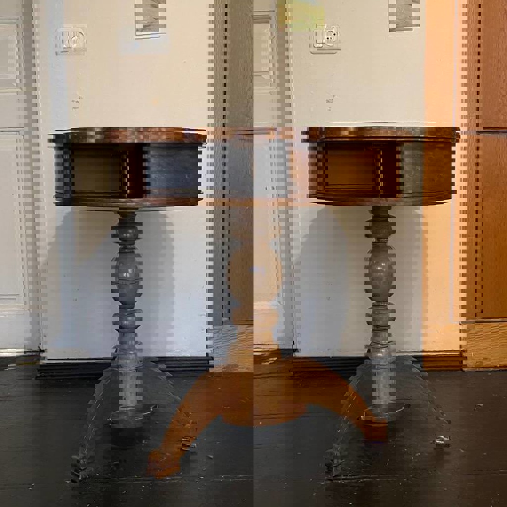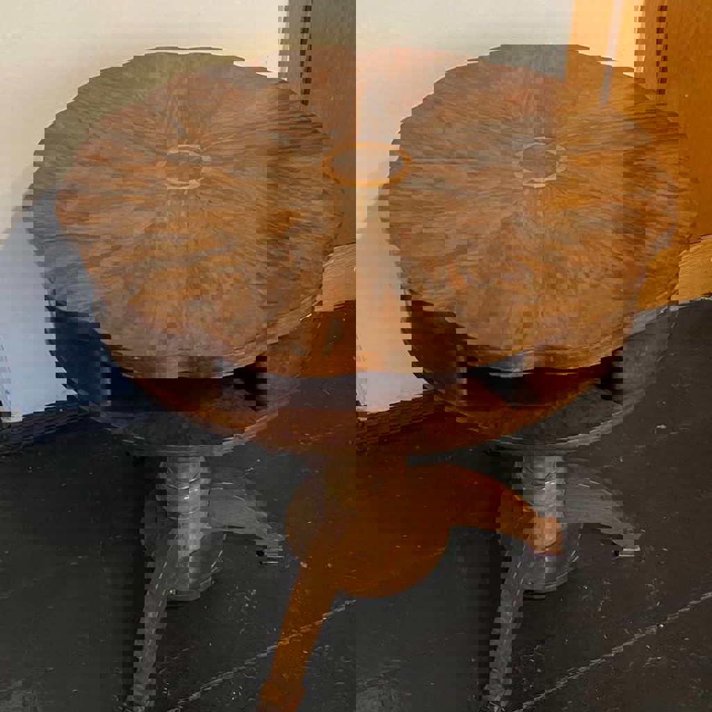 Очень красивый винтажный стол, легко разбирается (верх снимается от ножки) и перевозится даже в легковом авто, крышка крутится, удобно внутри хранить вещи, высота: 72 см, диаметр 71 см