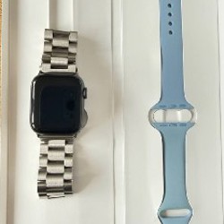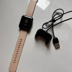 40мм ремешок оригинальный, в комплекте родной шнур для зарядки и сменный ремешок (металлический), зарядку держит день, выполняет все функции, на экране есть потертости- носила без пленки.