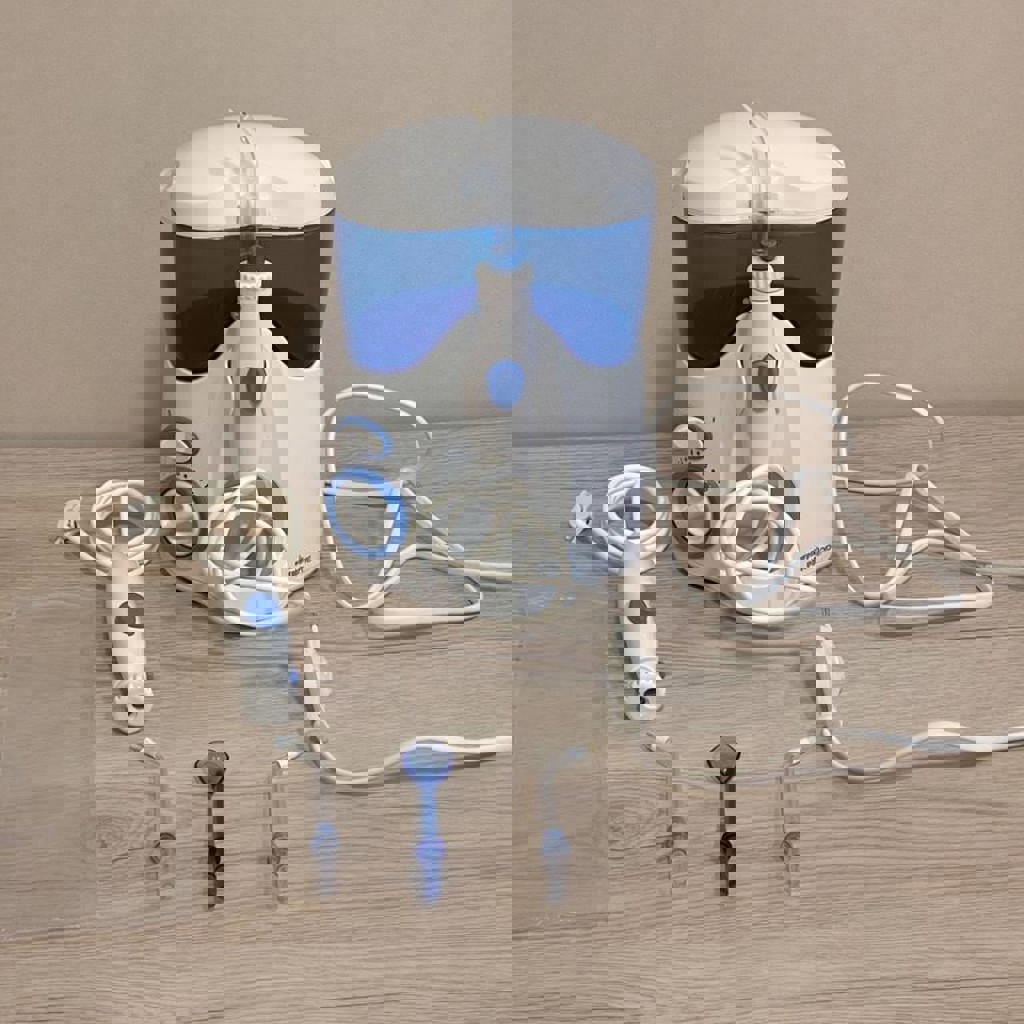 Стационарный ирригатор для полости рта, классическая модель Waterpik. Работает от сети, регулируемый напор воды, большой резервуар для воды, в комплекте несколько насадок. Состояние: хорошее, полностью рабочий. Комплектация: основной блок, ручка-насадка+ одна дополнительная, 3 насадки(новые, не использовались). Идеален для ежедневной гигиены, ухода за дёснами и очищения межзубных промежутков.