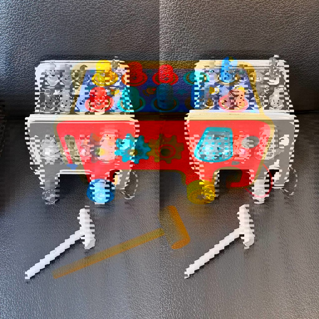 Многофункциональная: можно забивать фигурки молоточком, крутить шестерёнки и изучать цифры. Развивает моторику, координацию и внимание.
