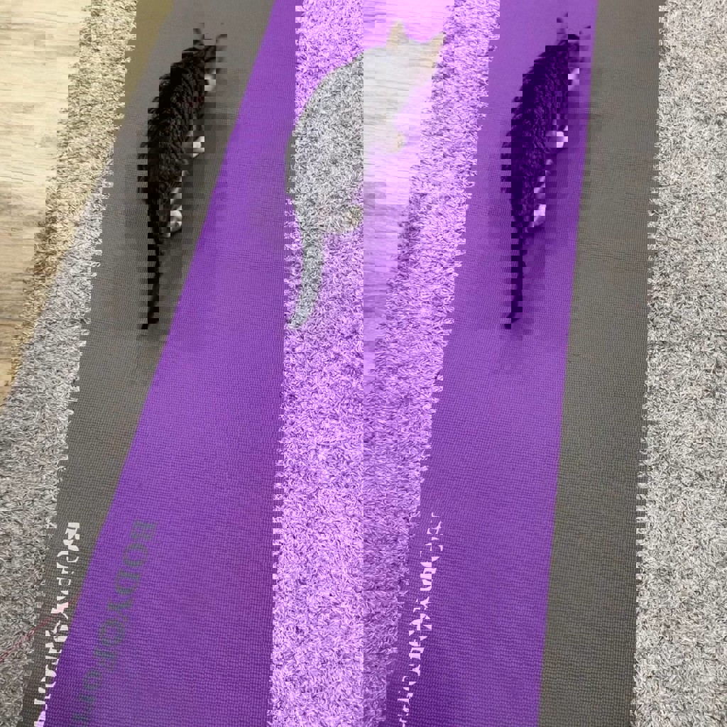 Коврик для йоги фиолетовый. С одной стороны зацепы от котячьих коготков, вторая сторона - все супер. Этот коврик не как туристическая пенка, он из другого материала, держится на полу, не скатываясь.