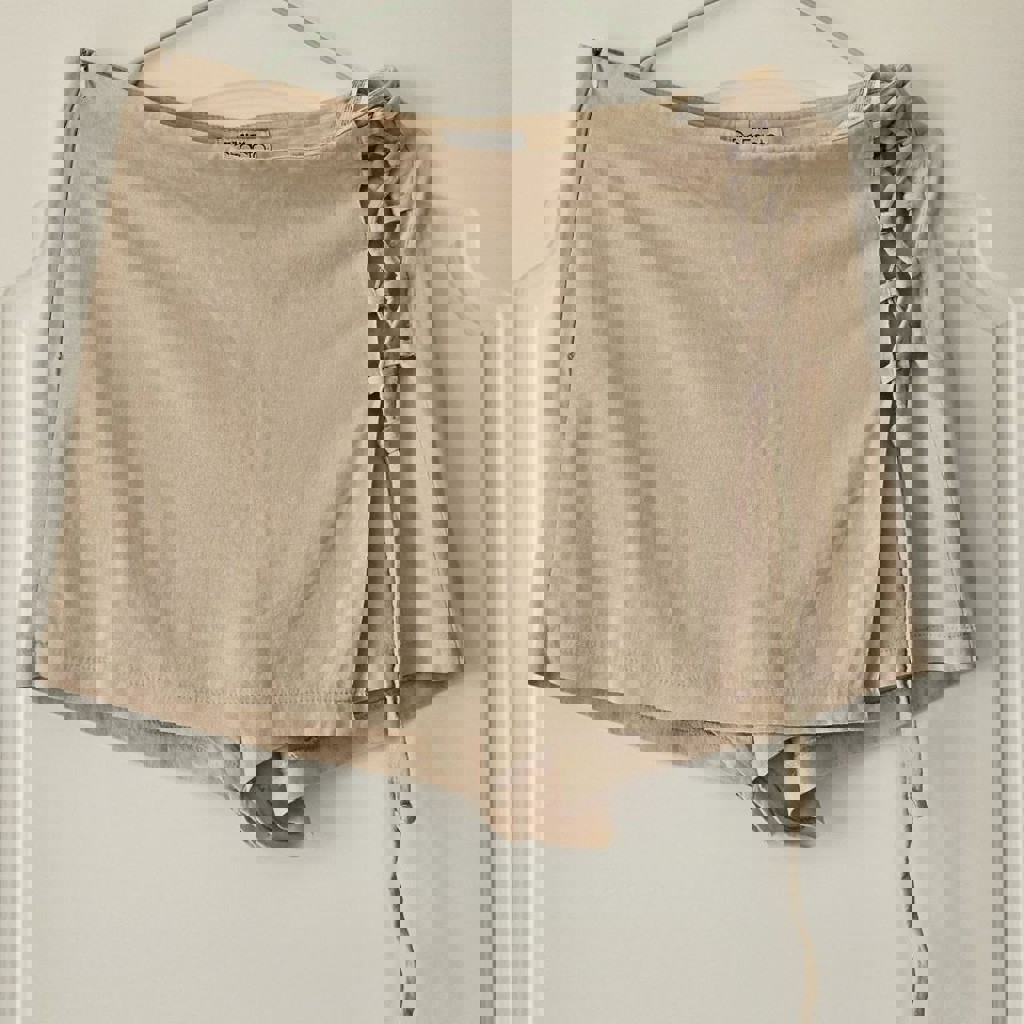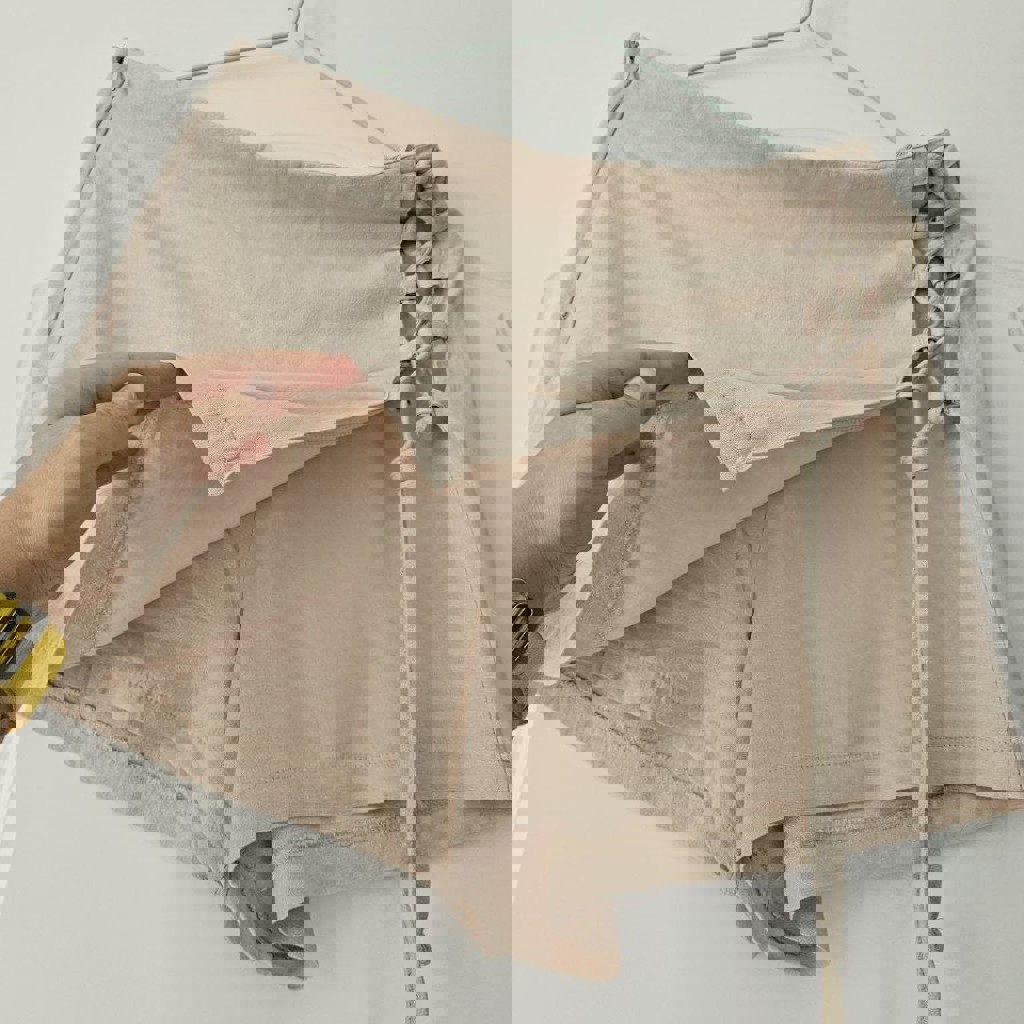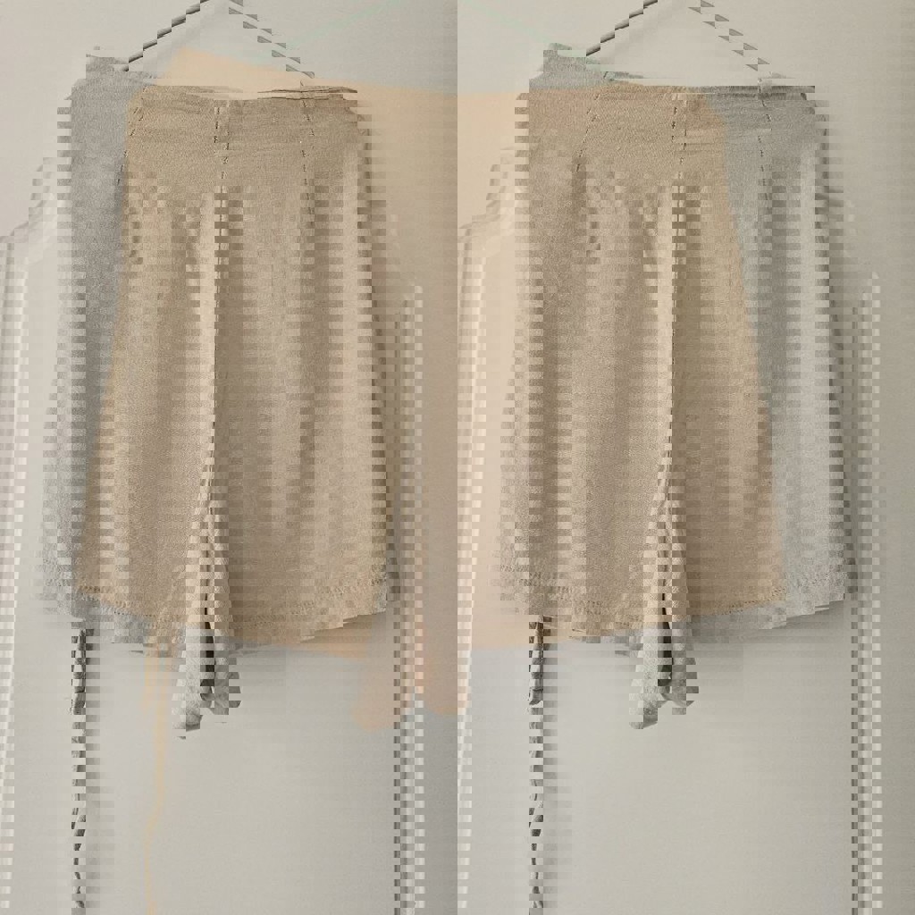 Бежевые льняные шорты, есть завязки в качестве украшения, короткие, но очень удобные