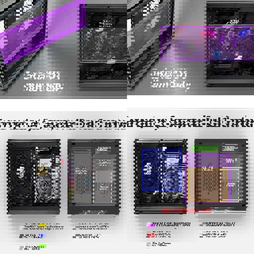 Длина 328мм, ширина 150мм, высота 235мм под материнскую плату Mini ITX, SFX/SFX L блок питания, максимальная высота кулера процессора 60мм, максимальная длина видеокарты 295мм. Состояние хорошее, на пластиковых стенках есть царапины, покупался в Тбилиси есть родная коробка