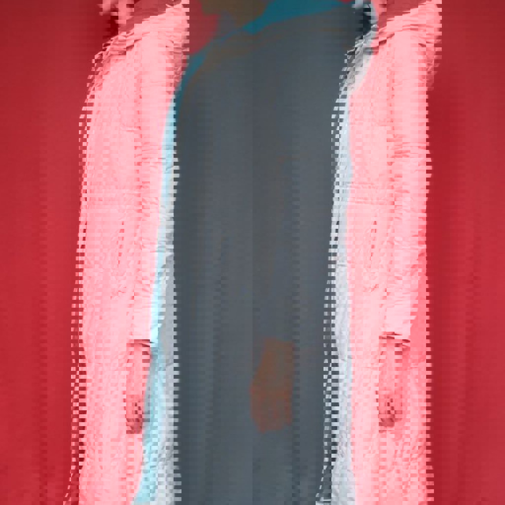 Бежевый с зелёной подкладкой. Молния расстёгивается как сверху, так и снизу. Возле кармана дырка.