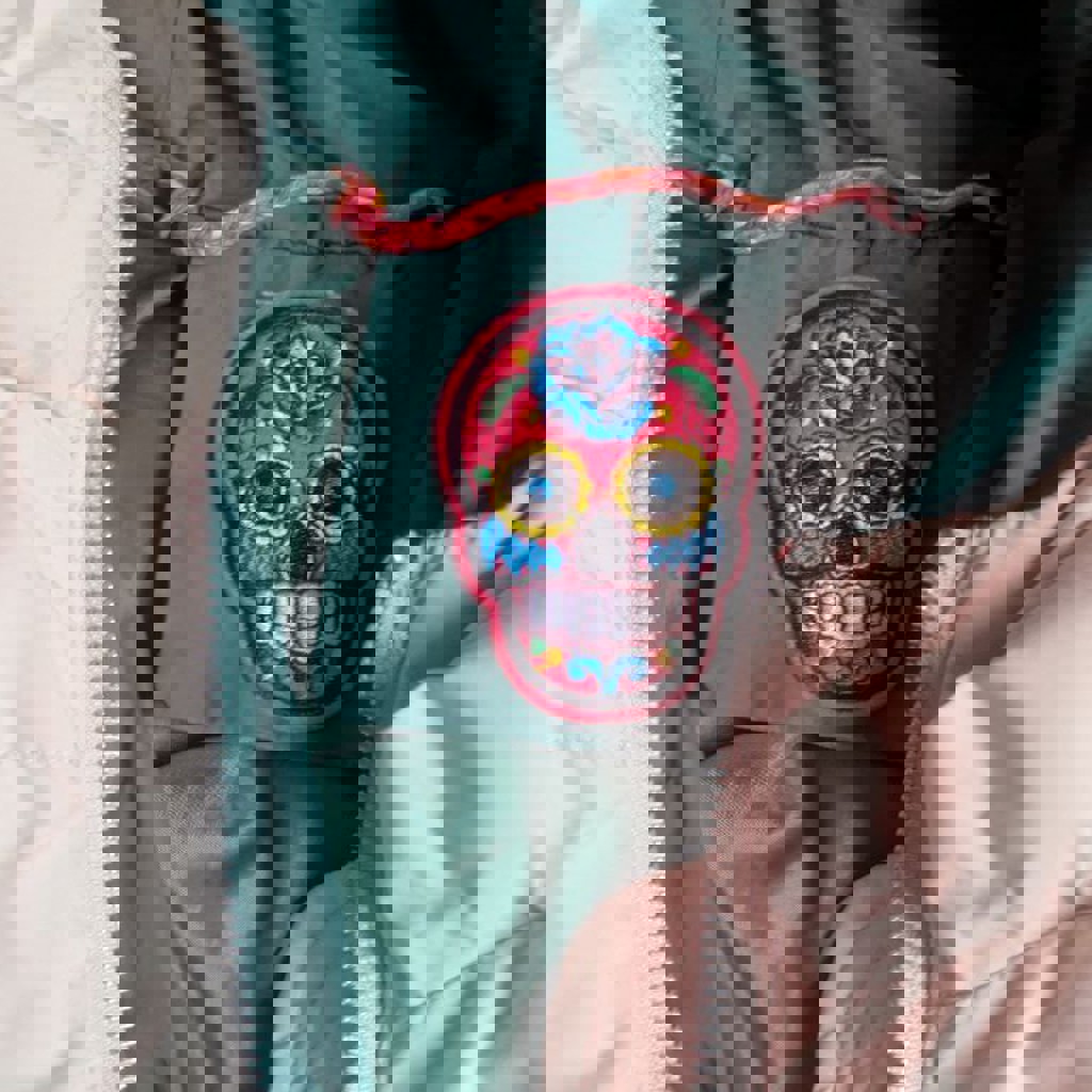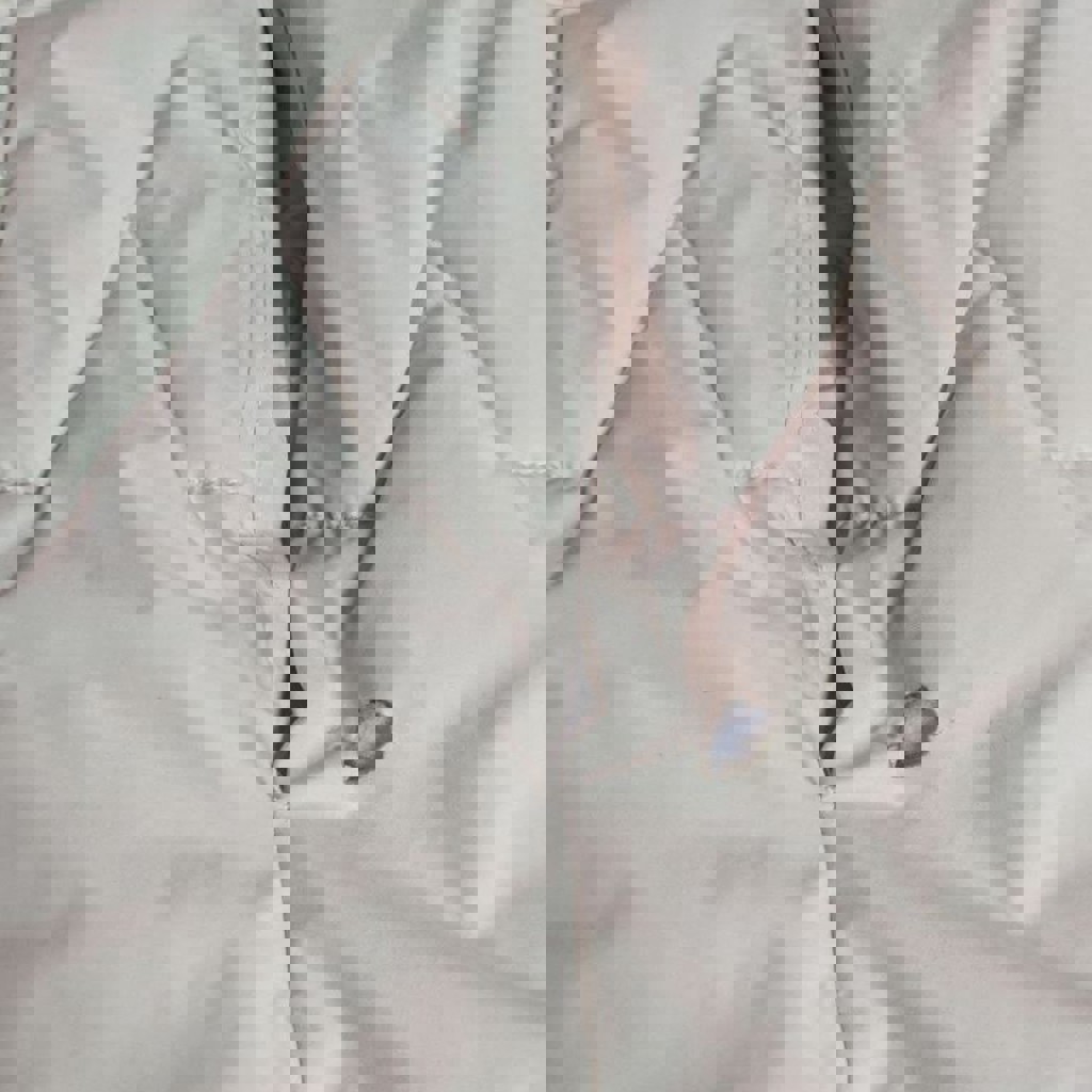 Бежевый с зелёной подкладкой. Молния расстёгивается как сверху, так и снизу. Возле кармана дырка