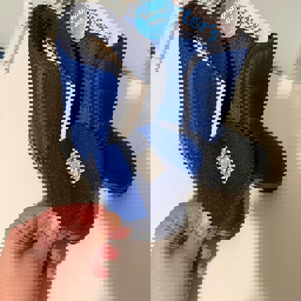 Размер 28, очень удобные, стильные и теплые, прорезиненная галоша, не промокают, с подсветкой.