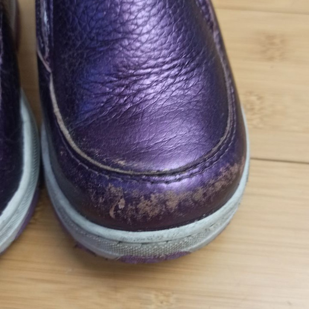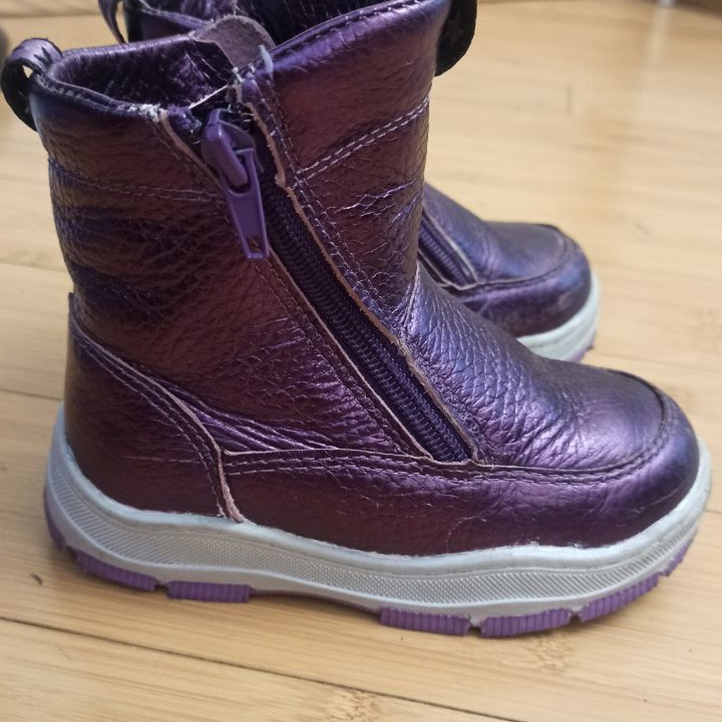 Натуральная кожа, натуральный мех. (Не шерсть) 24 размер. Стелька 16 см. Дочка носила неделю, но успела немного поцарапать, т к ездила на самокате